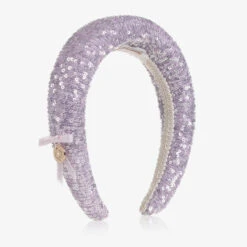 Girls stunning lilac sequin hairband by Junona. Thickly padded, this sparkly special occasion design, has a pretty bow detail at the side with a stitched logo charm.