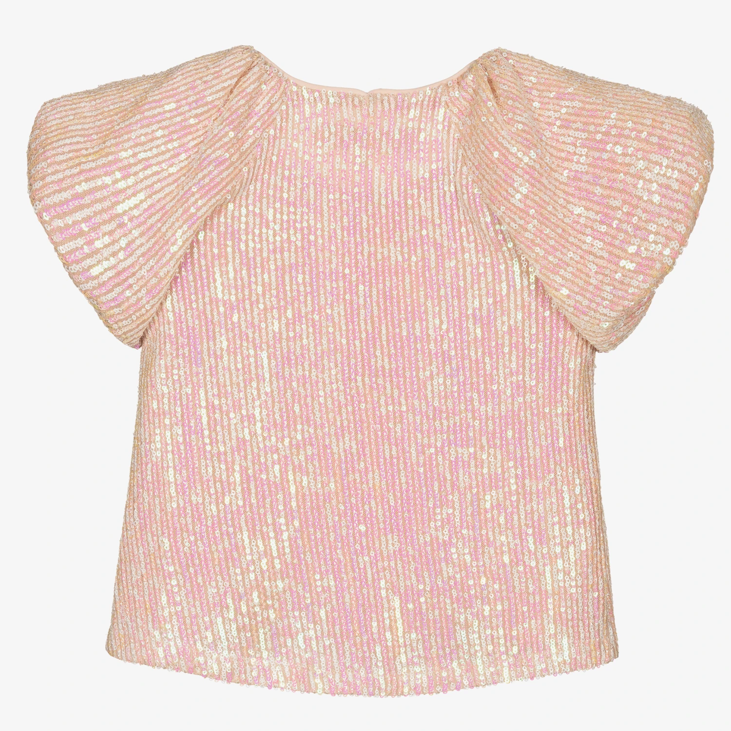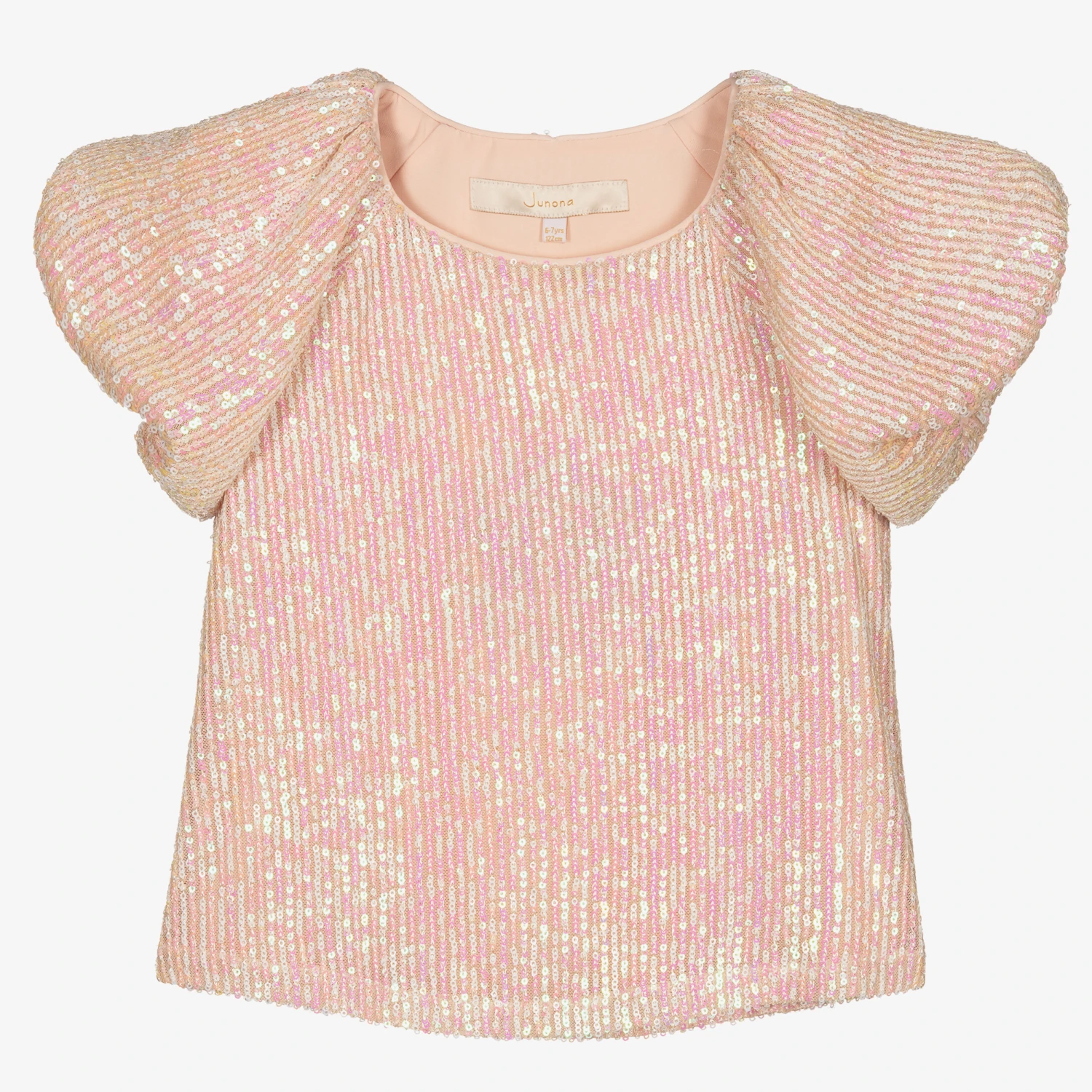 Exclusive to Childrensalon, a pale pink blouse by Junona, beautifully embellished with an all over sequin design. Soft with a stretch jersey lining, this special occasion top has elegant puffed sleeves and a rounded neckline.
