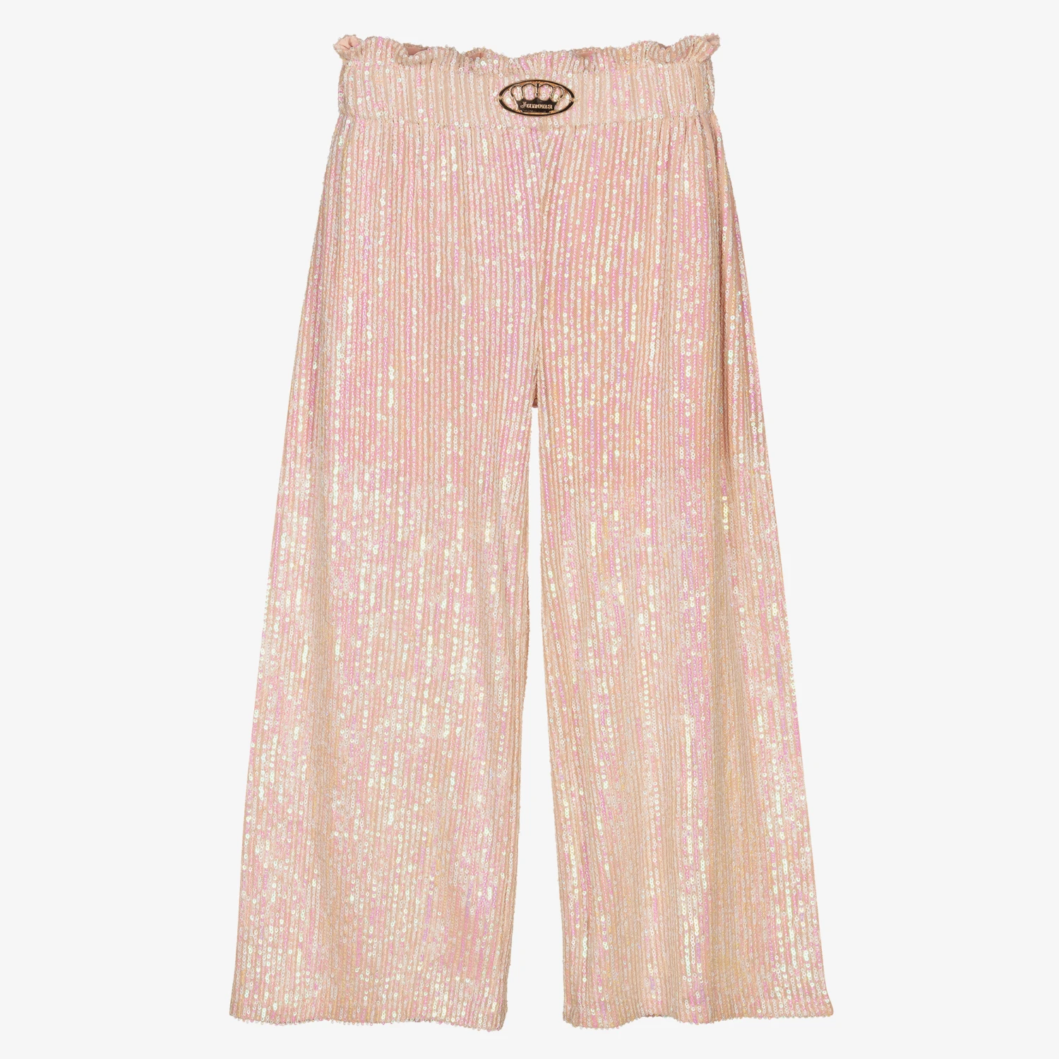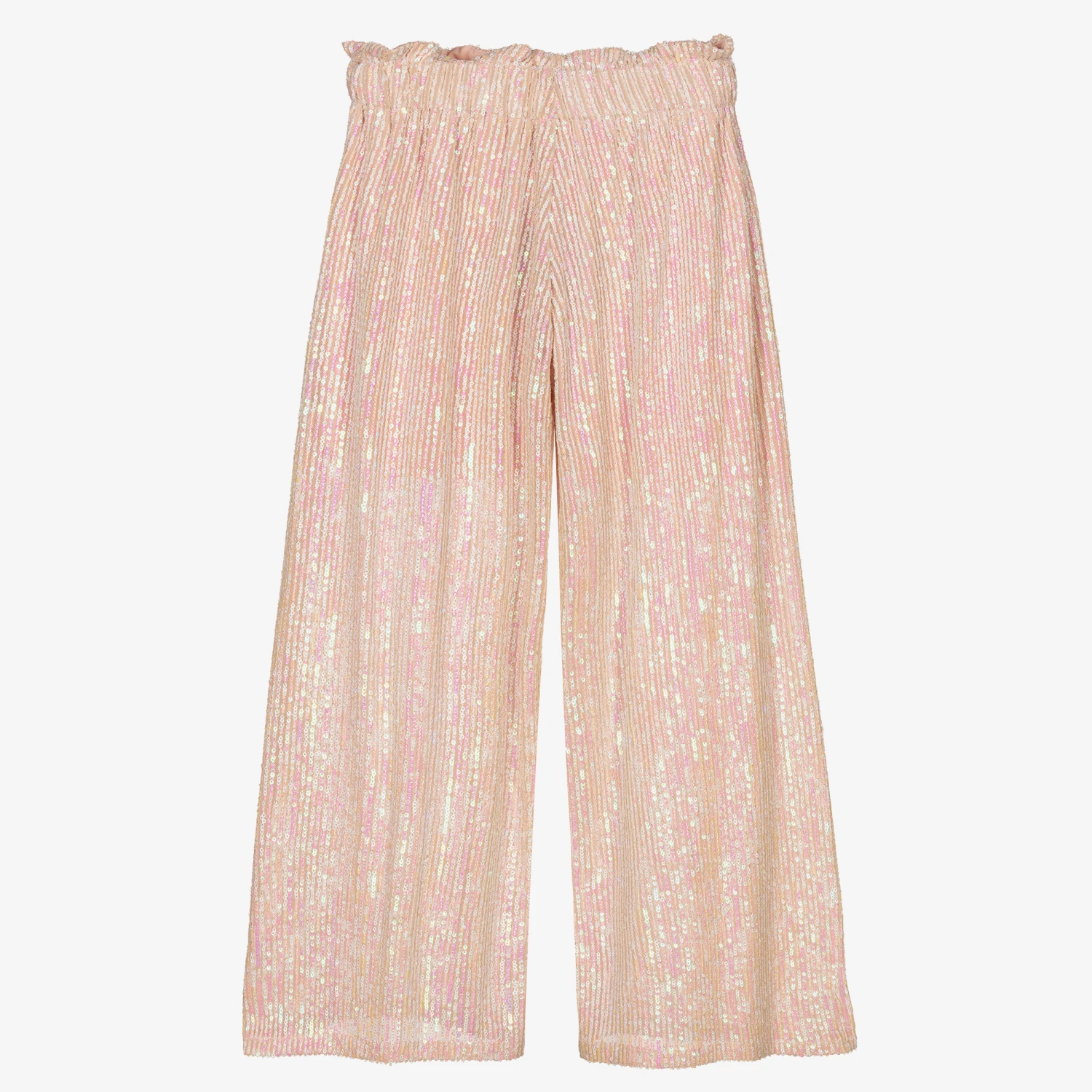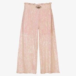 Exclusive to Childrensalon, a stunning pair of pink sequin trousers by Junona. Made from soft sequins with a stretchy jersey shorts lining, these wide-leg trousers are comfortable and stylish. Lightly gathered, the elasticated waistband has a gold branded charm on the front, to complete the look.