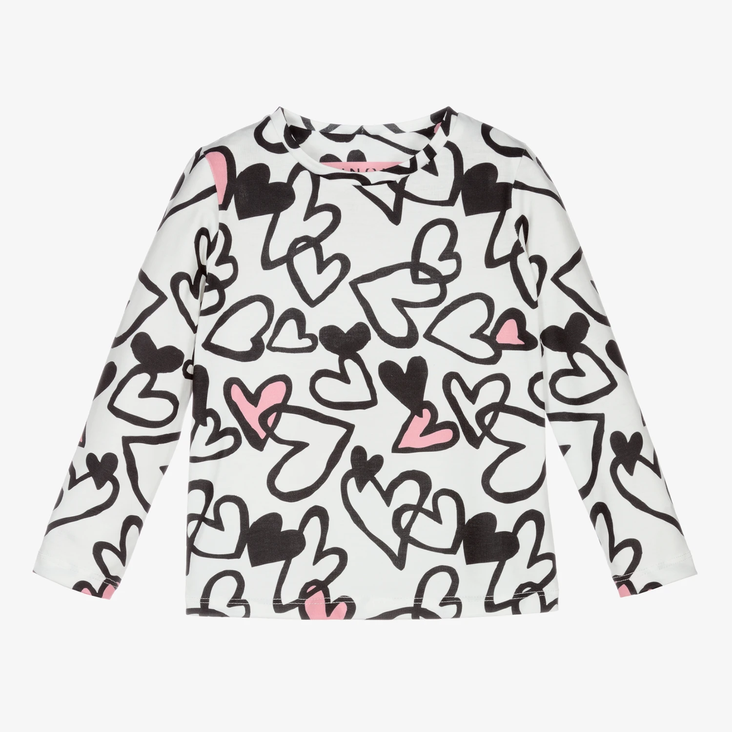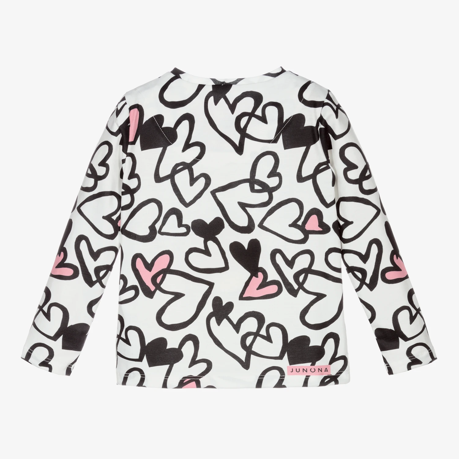Girls white long-sleeved top from Junona, with a lovely black and pink hearts print. It is made in soft and stretchy cotton jersey.