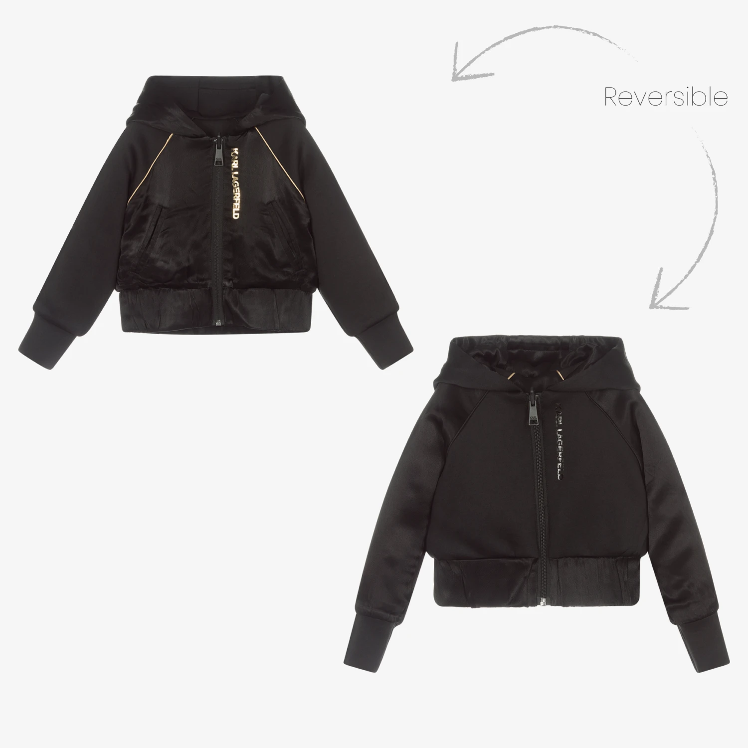Girls black reversible zip-up hoodie by KARL LAGERFELD KIDS, made in mid-weight viscose jersey with viscose satin. The silky satin side has casual jersey sleeves, shiny gold piped trims and a gold logo print on the front. Switch up your look with the jersey reverse side, with contrasting satin sleeves and a subtle black logo print.