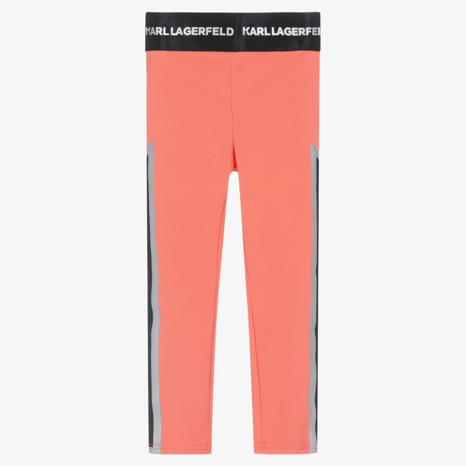Sporty orange leggings for girls, unmistakably by KARL LAGERFELD KIDS. Made in silky jersey, they have an elasticated black waistband with repeat silver logos all around. The black mesh stripes down the legs are bordered with reflective silver trims.