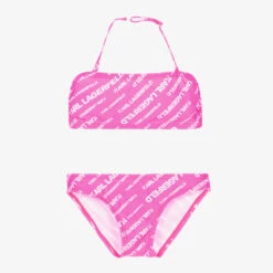 Bright pink bikini for girls by KARL LAGERFELD KIDS, patterned with white logos. The bandeau-style top has an adjustable halter neck. Silky smooth and stretchy, both are lined on the front side for extra comfort.