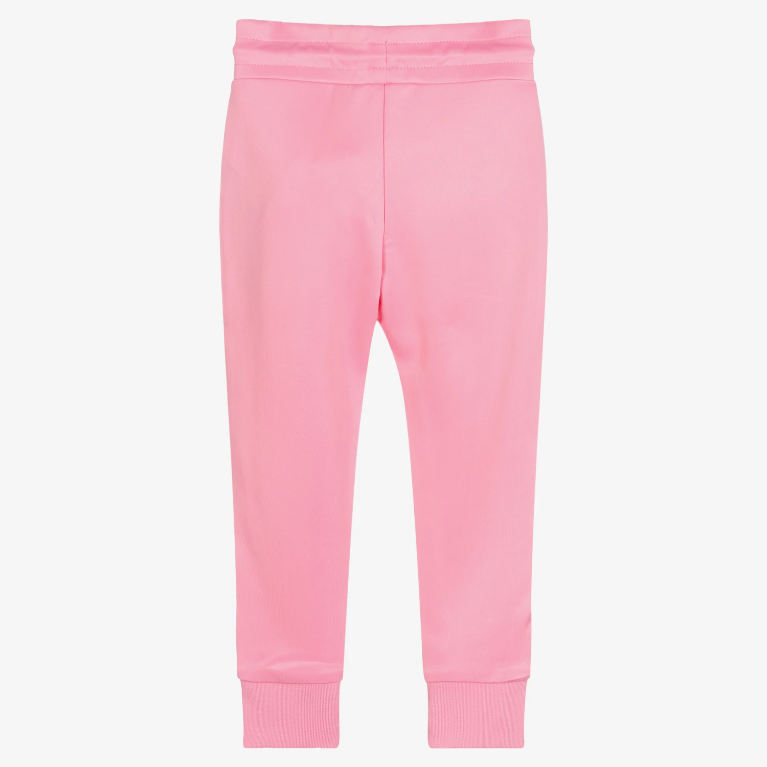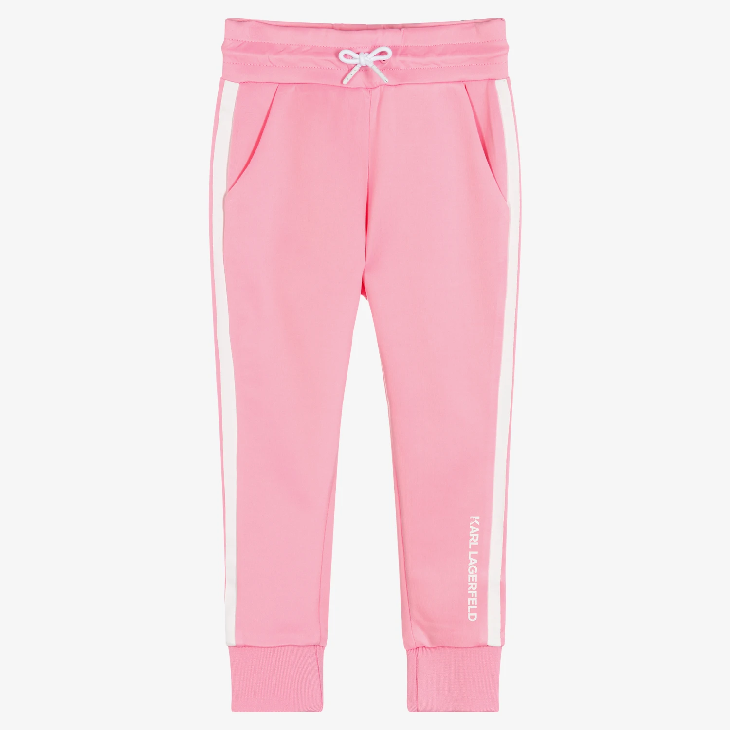 Sporty pink joggers for girls by KARL LAGERFELD KIDS, with a white logo on one leg and printed white trims. It has ribbed ankle cuffs and useful front pockets for everyday essentials. They are made in super soft and smooth jersey for comfort, with an elasticated drawstring waistband for a good fit.