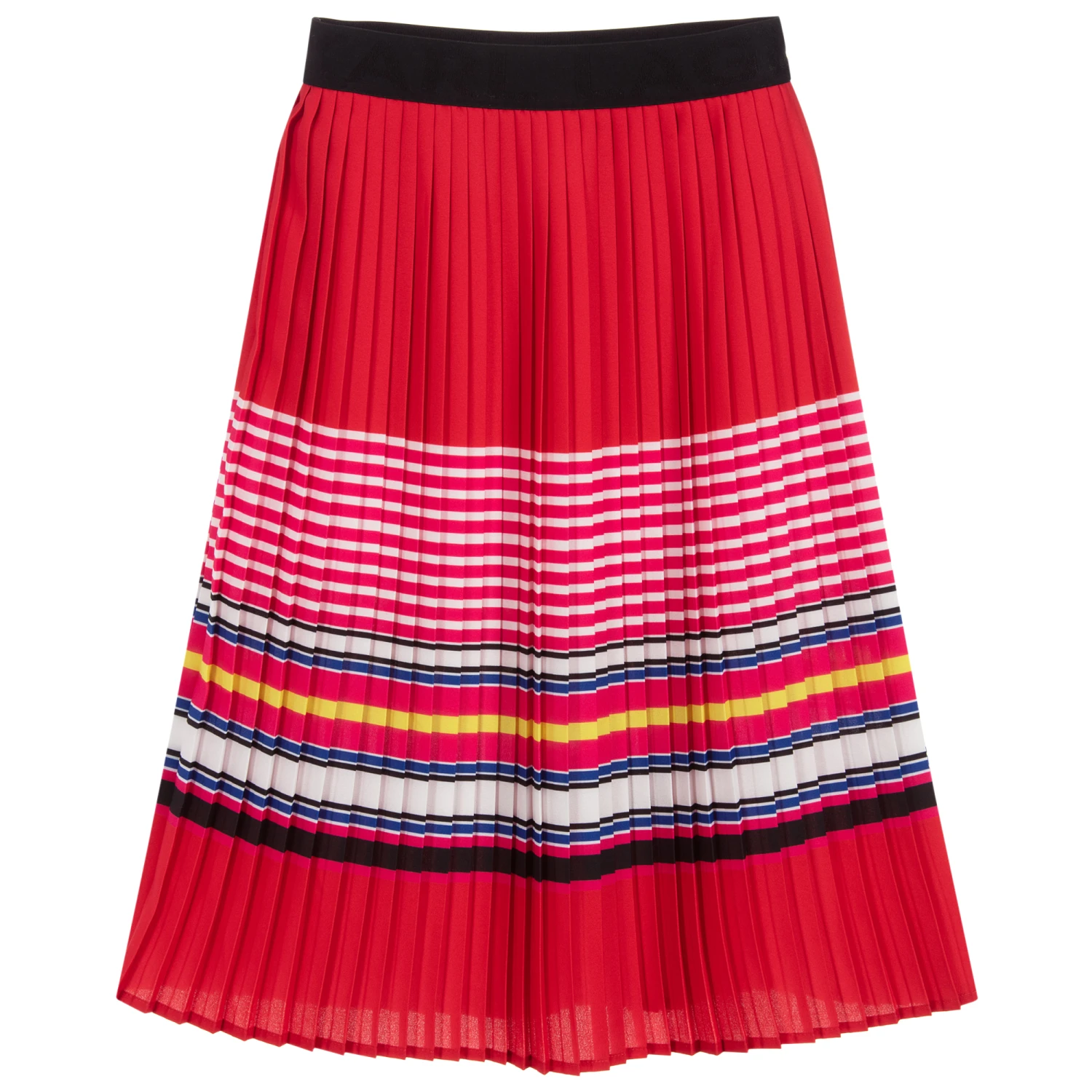A smart red Mini-me polyester crêpe skirt, for girls by KARL LAGERFELD KIDS. It has an elegant mid-calf length and colourful stripes in pink, white, blue, yellow and black. It is half lined in lightweight viscose and has an elasticated black waistband with woven branding.