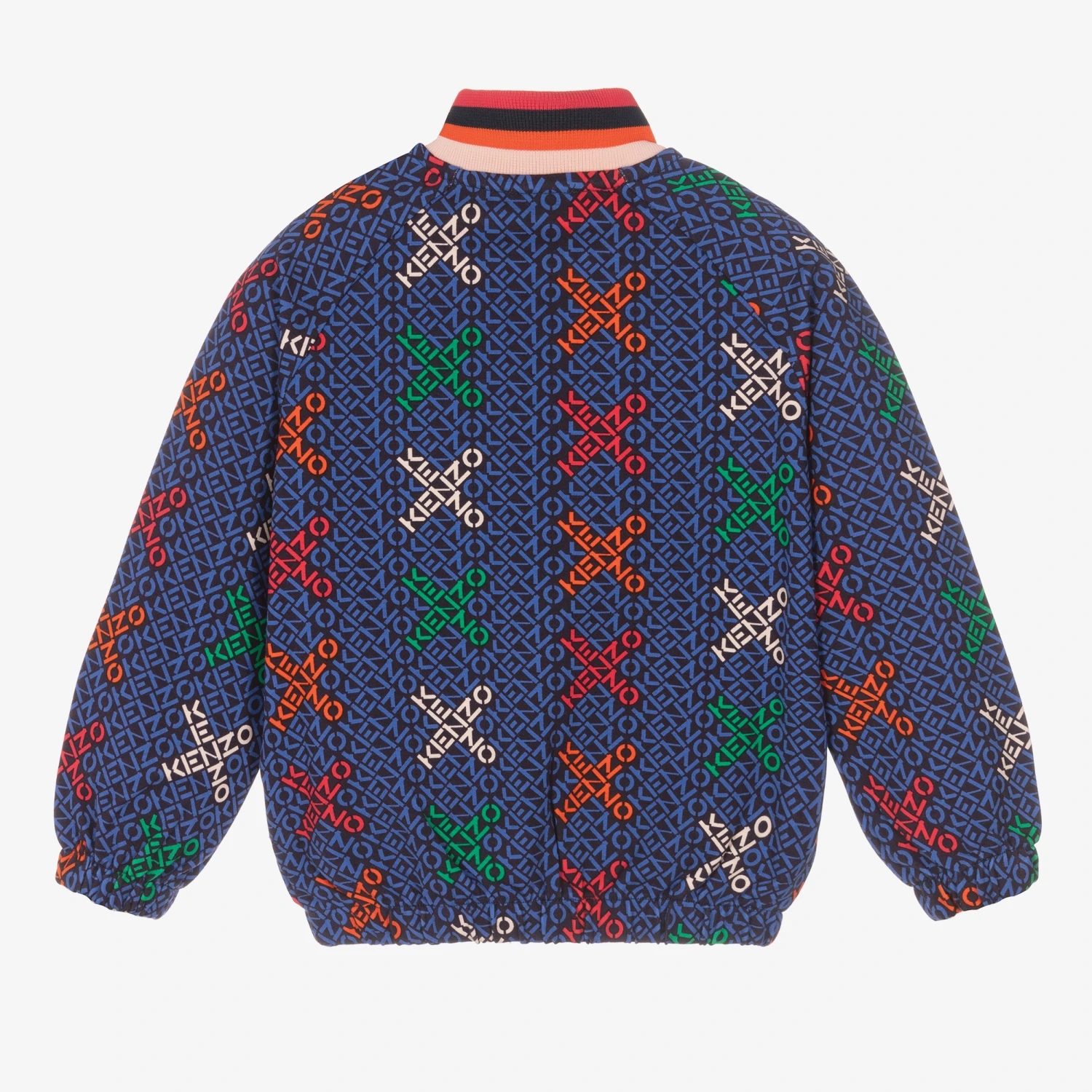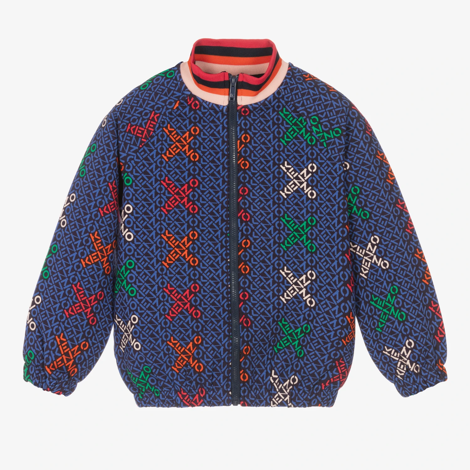 Girls blue technical jersey top by KENZO KIDS. Soft and stretchy, the fabric has an all-over tone-on-tone logo print, with a colourful Cross logo print overlay. The funnel neck is ribbed and stretchy in striped pink, orange, blue and red. There is a front zip fastening and side pockets.