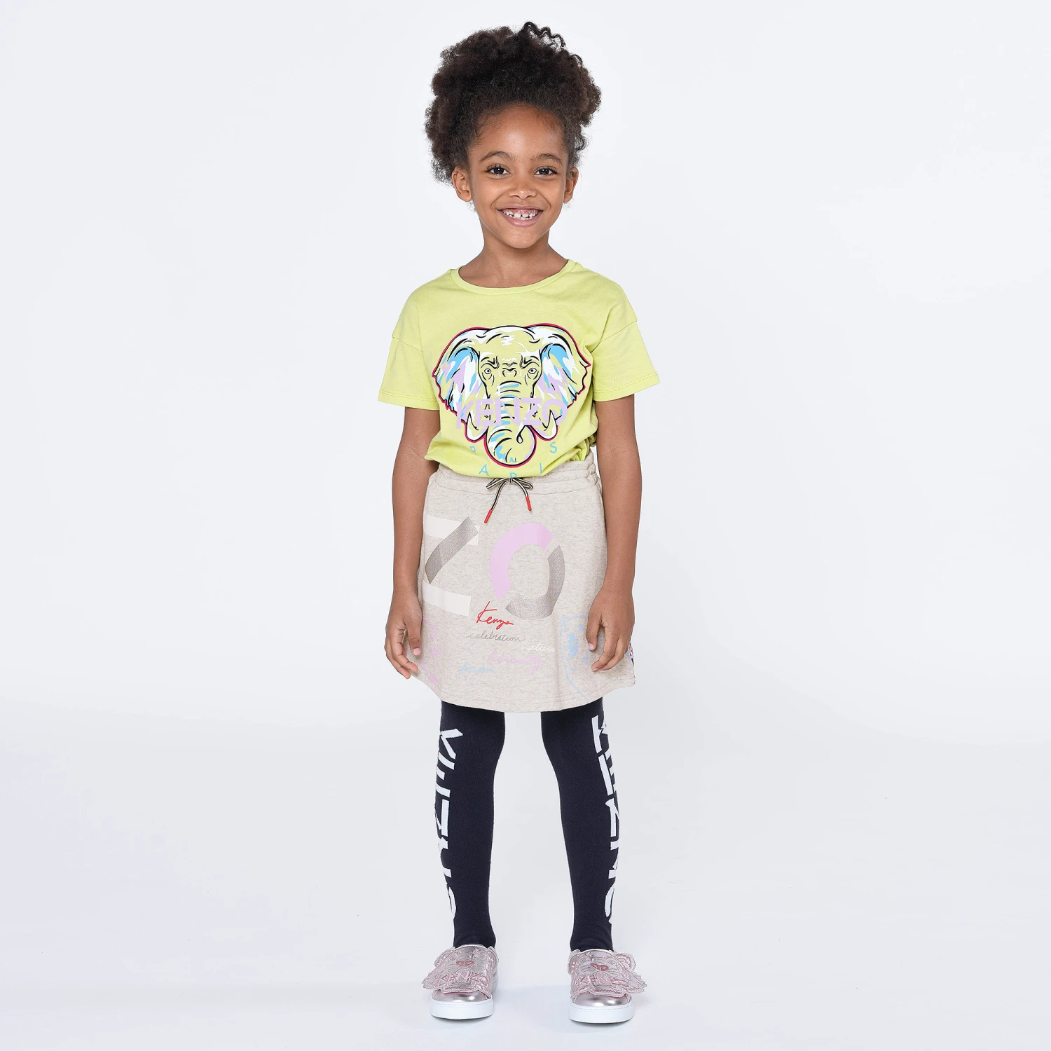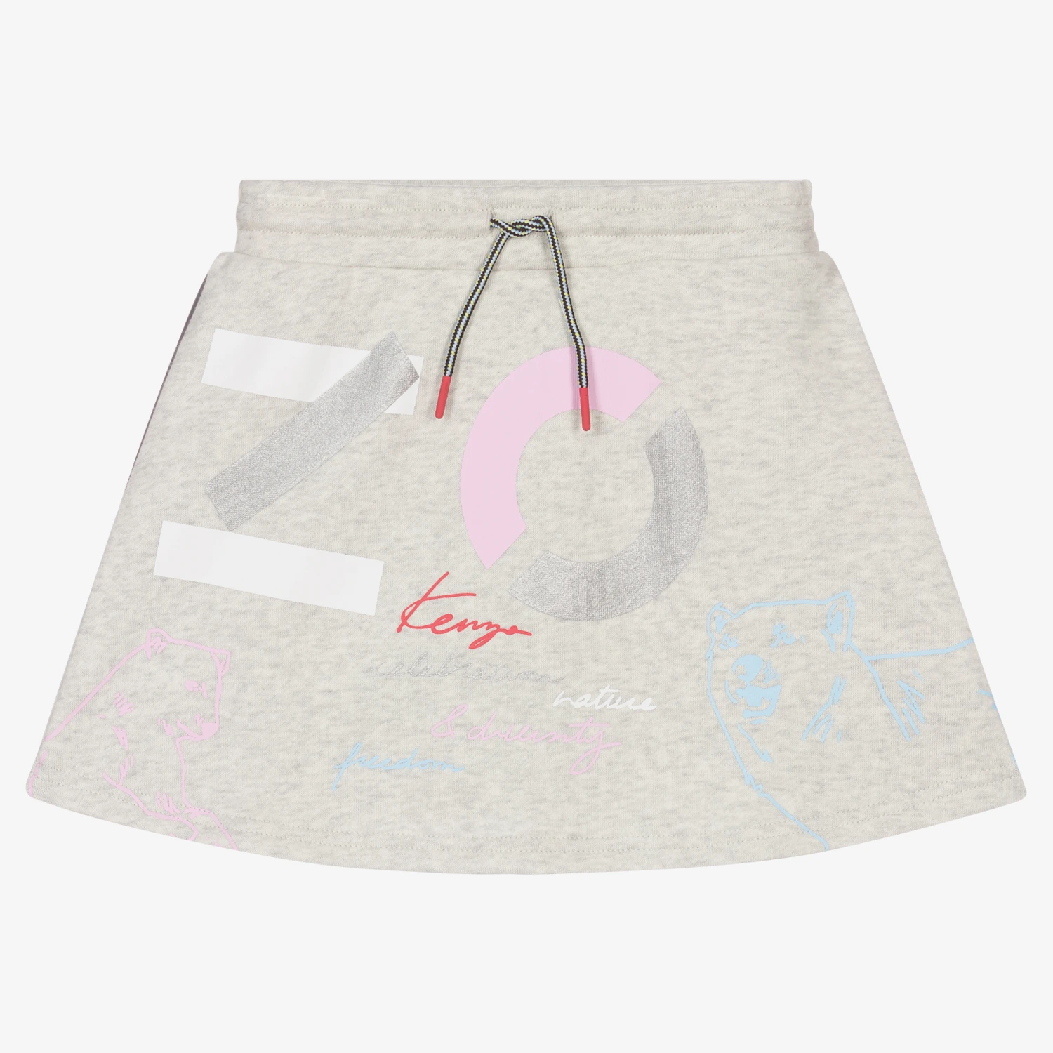 Grey marl skirt for girls by luxury French designer KENZO KIDS. It is printed with the brand’s iconic logos such as the Tiger and bear in pink, blue and brown with shiny silver. Made in comfortable, mid-weight cotton jersey, it has a pale blue fleecy inside and a drawstring waistband.