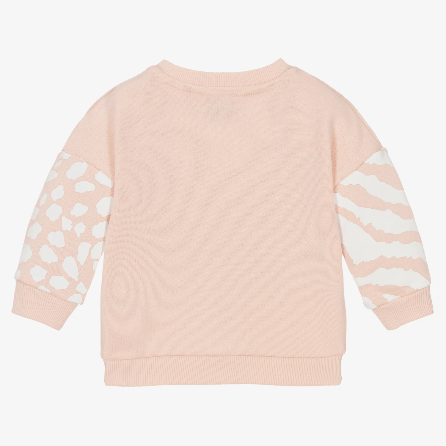 Pink sweatshirt for little girls by KENZO KIDS, made in soft cotton jersey. The front is embroidered with the brand’s Tiger & Friends motif in shades of pink, white and black. The sleeves have white animal prints and there are popper fastenings on the shoulder. The cuffs and hems are gently ribbed.