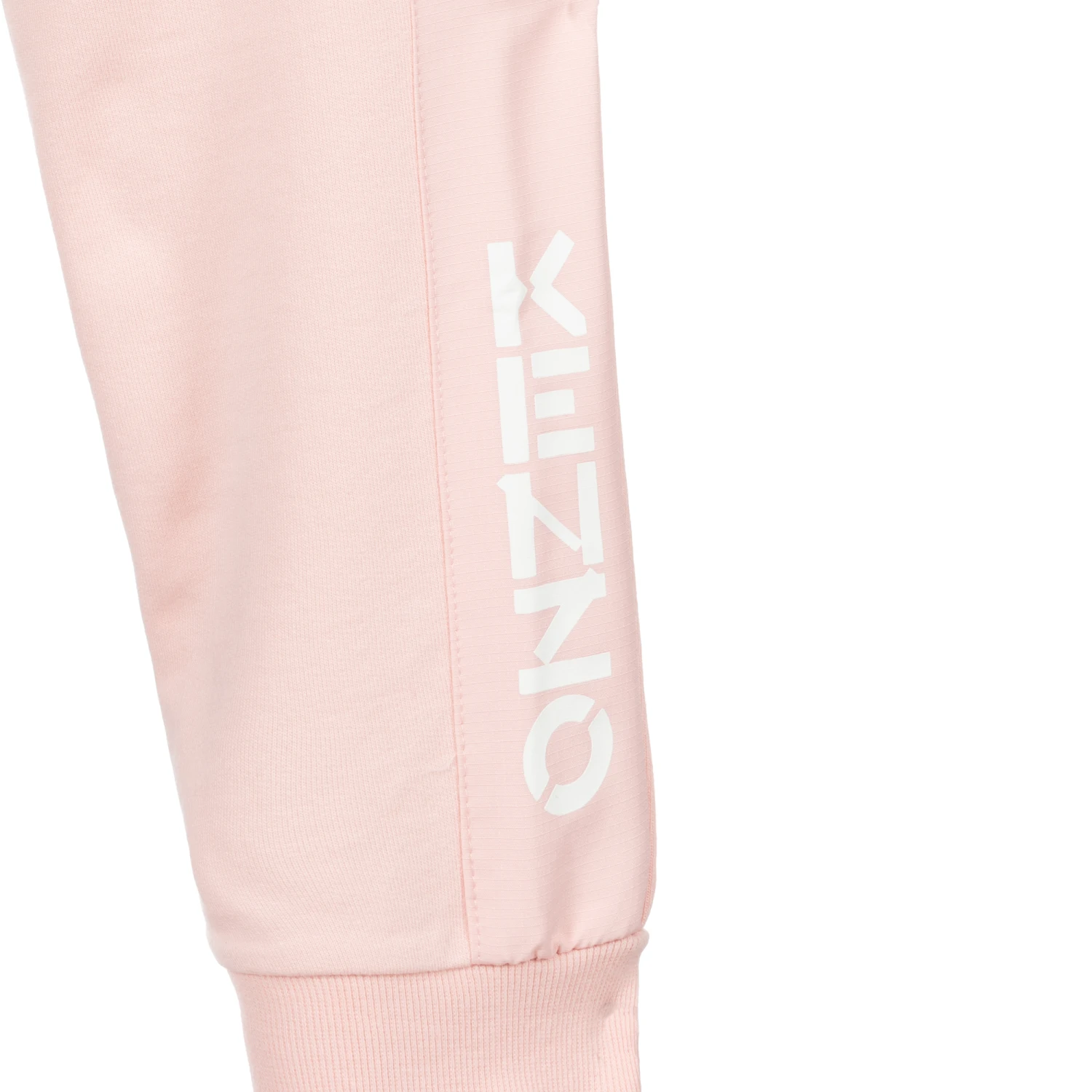 Girls pink joggers by KENZO KIDS, with utility-style panels down each leg and a white logo print on one side. Made from soft jersey, these lightweight trousers have a stretchy adjustable drawstring waistband and a single back pocket, printed with a white K motif.