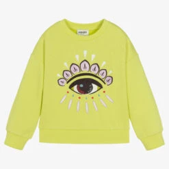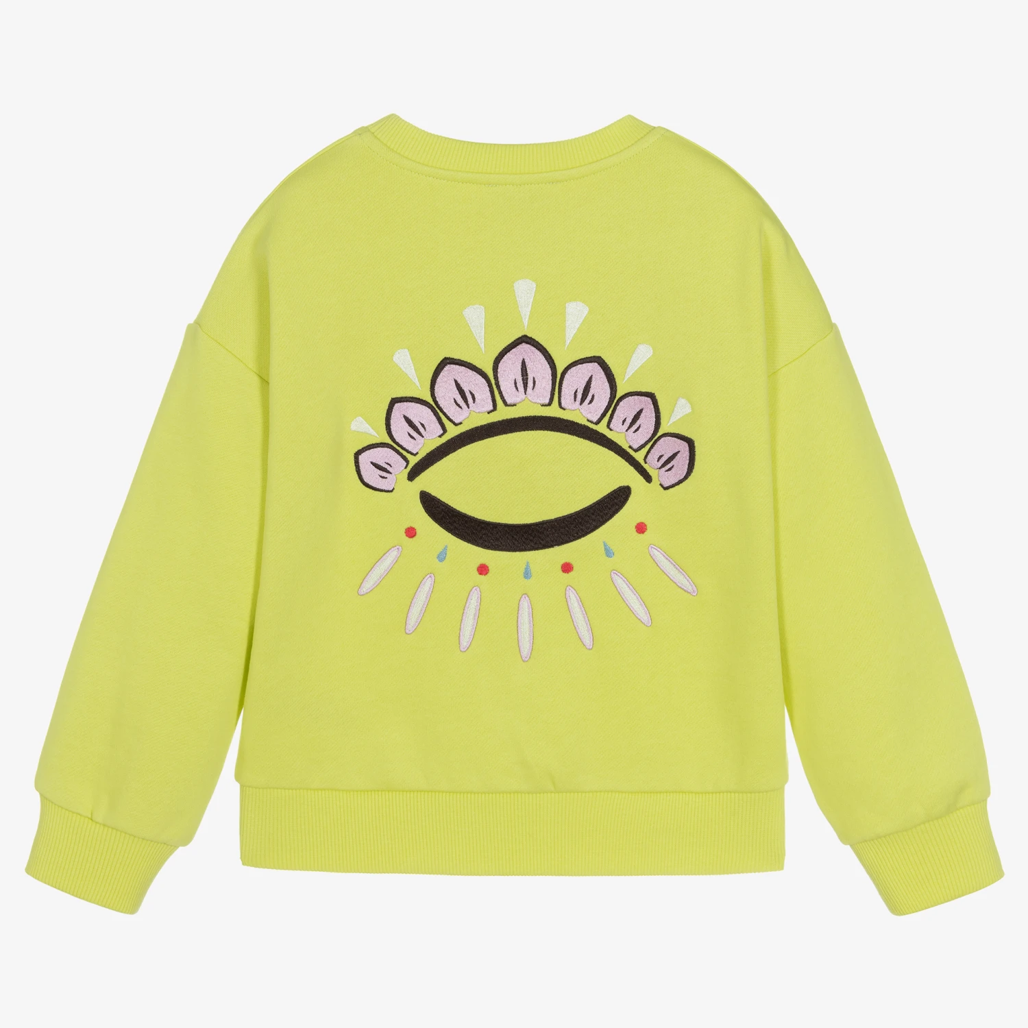 Yellow sweatshirt for girls by luxury French designer KENZO KIDS, with a pink and black embroidered Eye logo on the front and a Wink logo on the back. It is made in comfortable cotton jersey with a fleecy inside and ribbed trims.