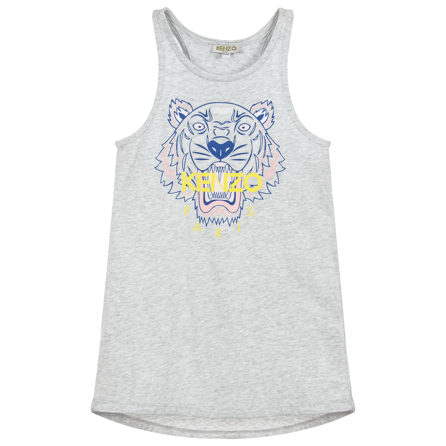 Fun, grey marl dress for girls, by Kenzo Kids. Inspired by the adult collection it has the Iconic Tiger and logo in pink, blue and yellow embroidered on the front. Made soft, comfortable lightweight cotton jersey.