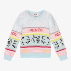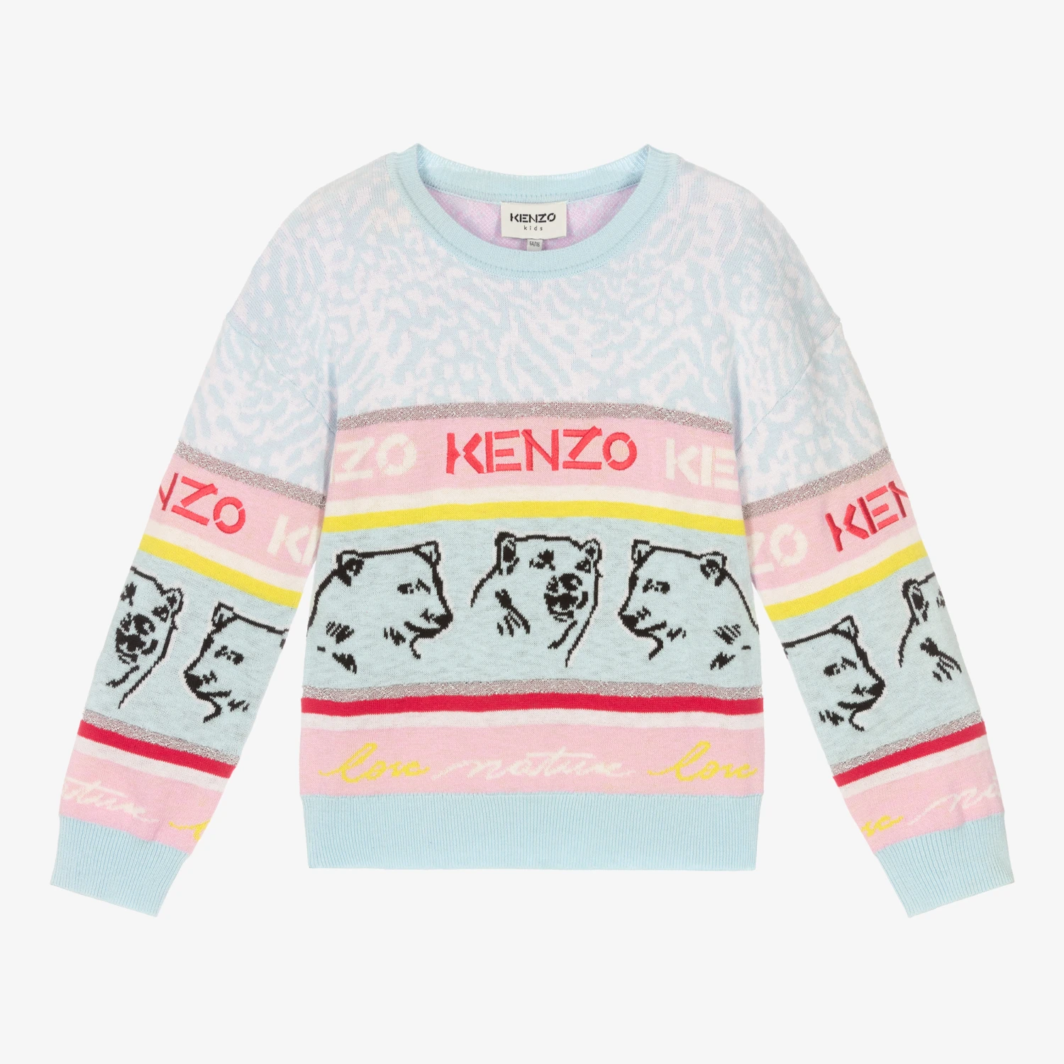 Pale blue sweater for girls by luxury French designer KENZO KIDS. It is striped in glittery silver, white, yellow and pink with embroidered logos and black bears on the front, back and sleeves.
