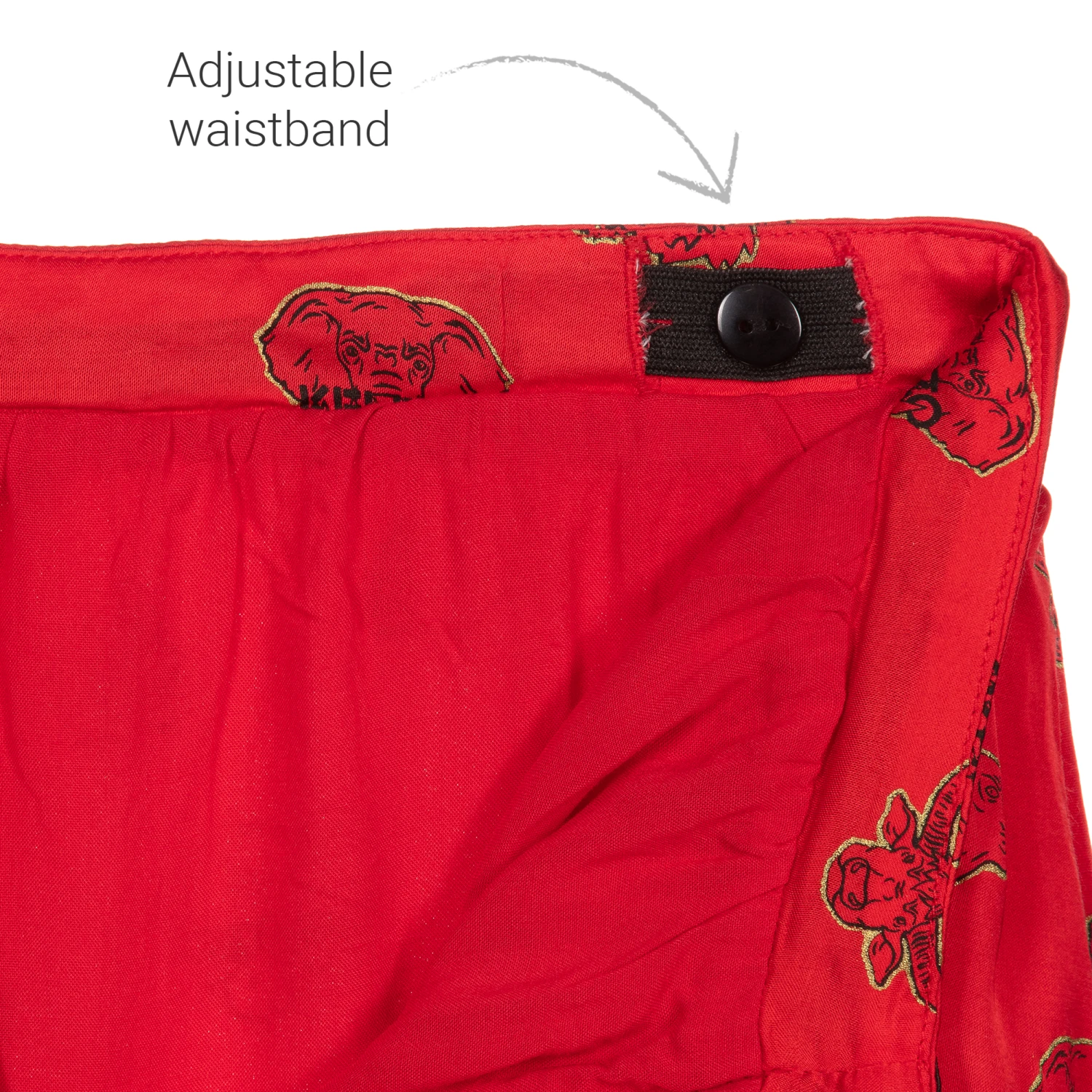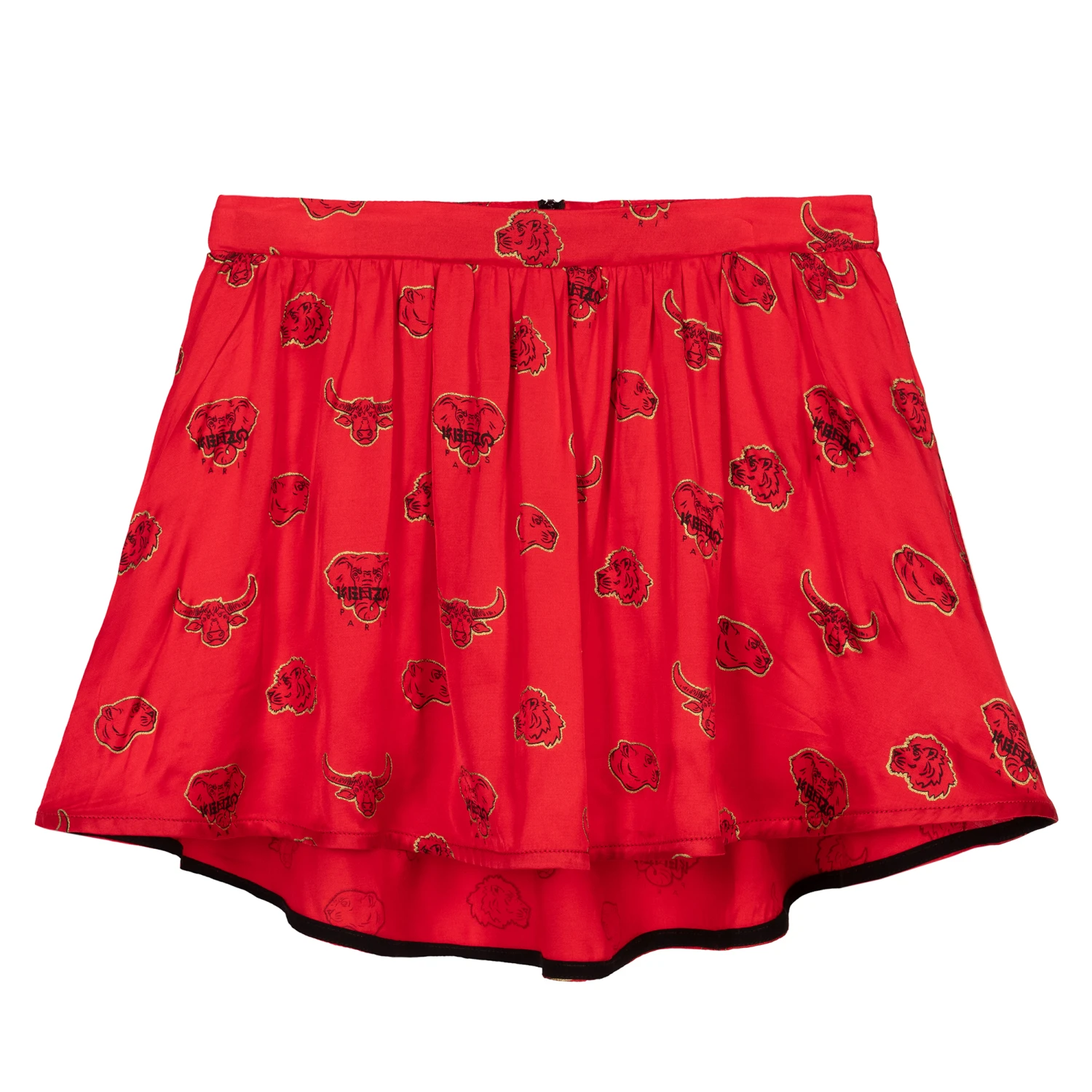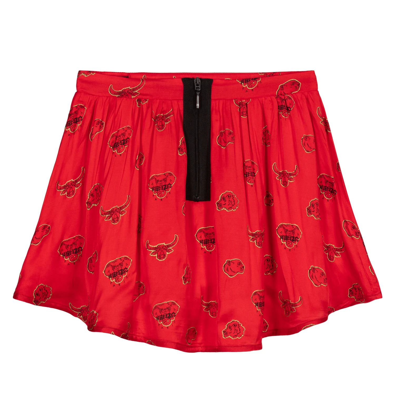 Designed for girls by KENZO KIDS, a soft and silky red viscose skirt in celebration of the Chinese New Year. Beautifully printed with black and gold Kenzo icons including the Elephant, Tiger and Ox. This pretty is fully lined for comfort, with a useful adjustable waistband and asymmetric hem.