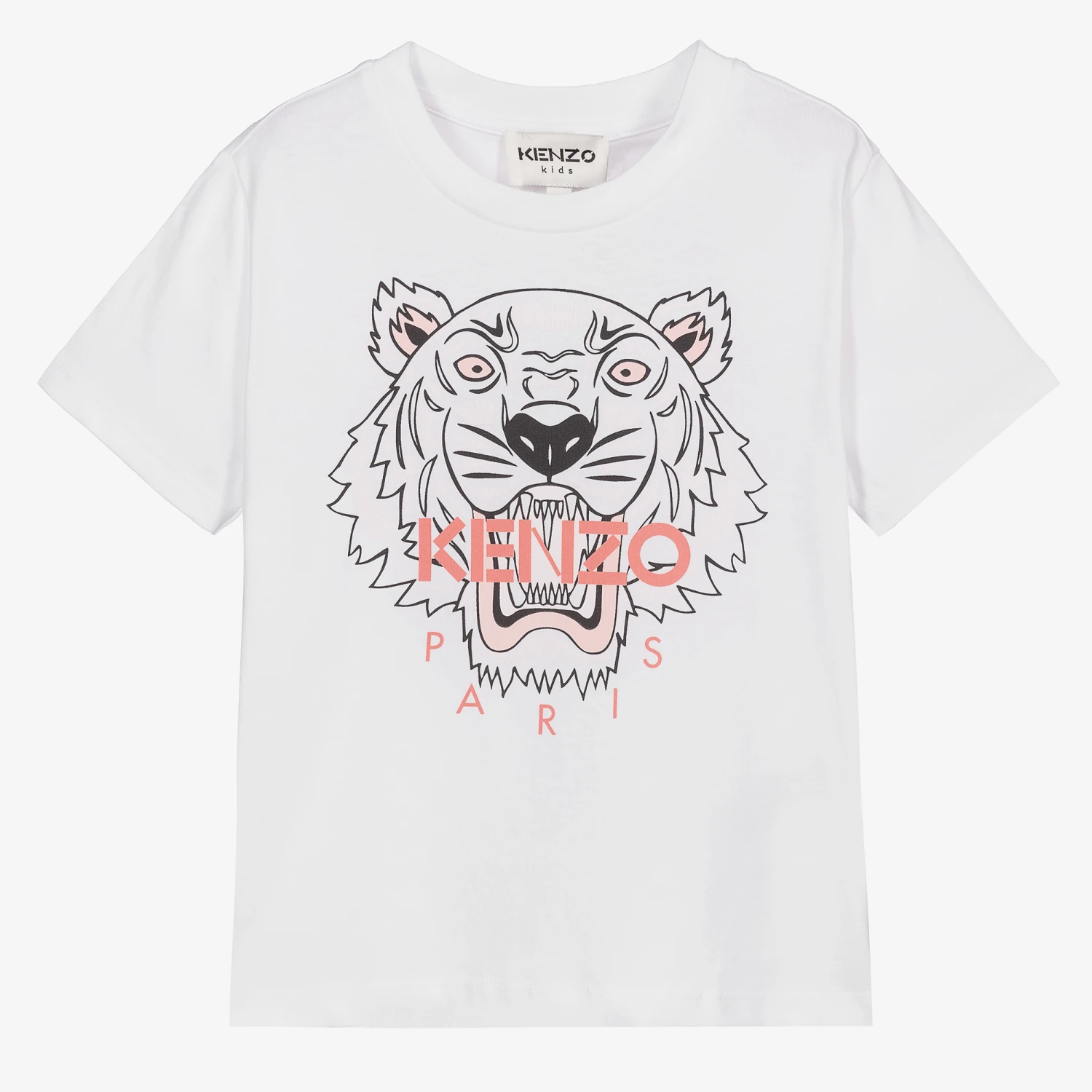 White T-shirt for girls by KENZO KIDS, made in soft organic cotton jersey. The brand’s iconic Tiger logo is printed on the front in pink.