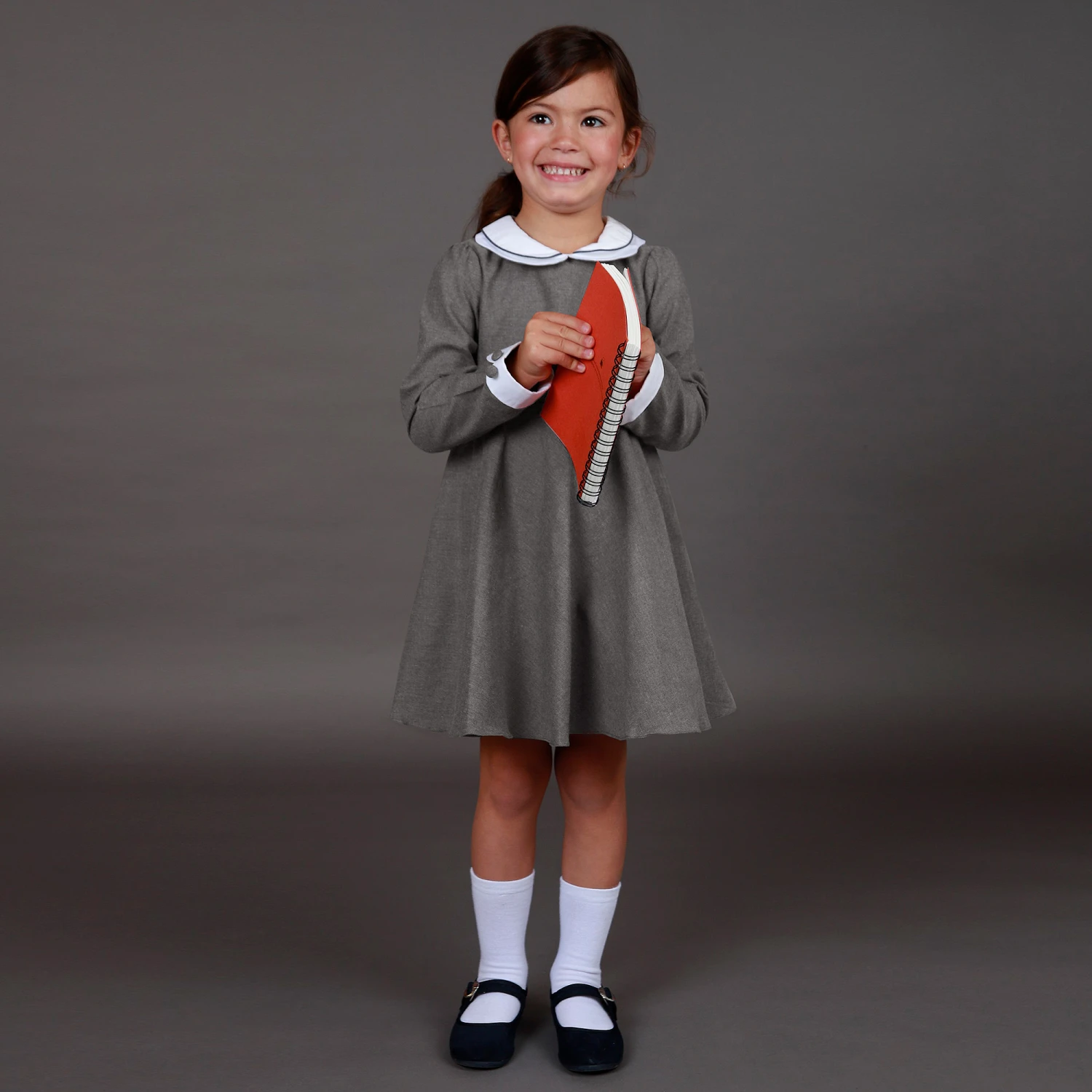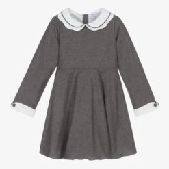 Pretty grey dress, handmade by French brand Kidiwi. Made in lightweight organic cotton twill, it has a double white collar, one with grey piping and the other scalloped. The sleeves have matching white cuffs with decorative, fabric-covered buttons that match the fastenings on the back. Fully lined, it has a beautifully flared skirt.