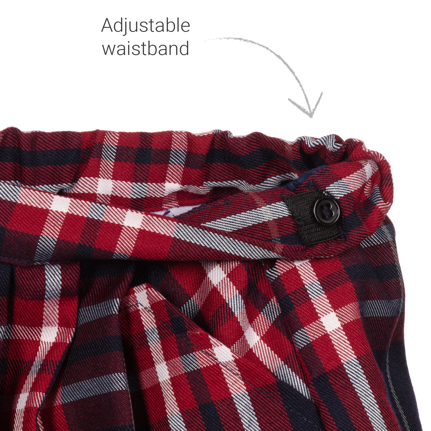 Navy blue and red checked skirt for girls, handmade in a soft viscose blend by Kidiwi . Comfortable to wear, it has a partly elasticated waistband which is also adjustable. There are pleats and pockets on the front.