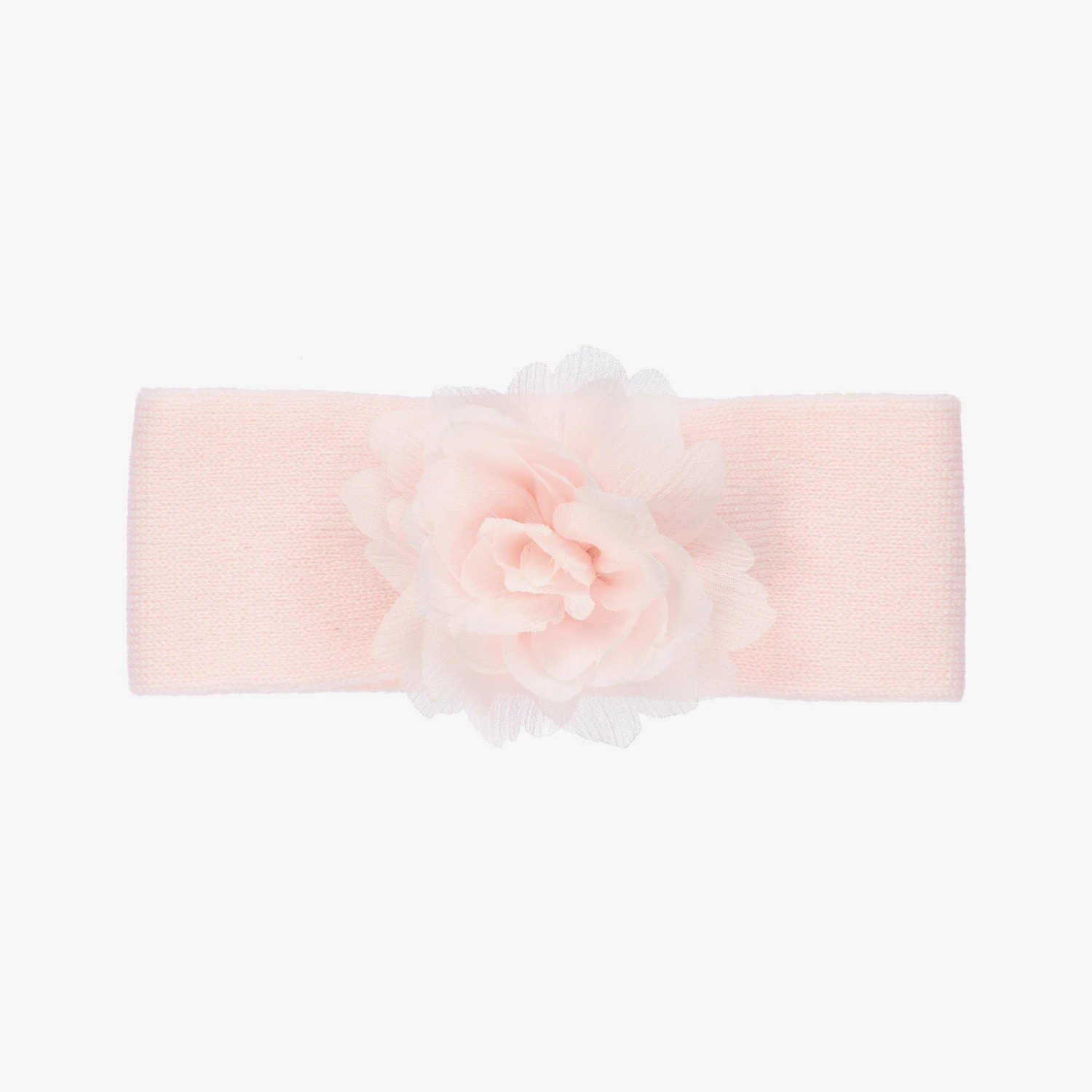 Younger girls pale pink headband by La Perla. Knitted in soft wool for comfort and warmth, it is soft and stretchy and embellished with a soft fabric flower in the centre.