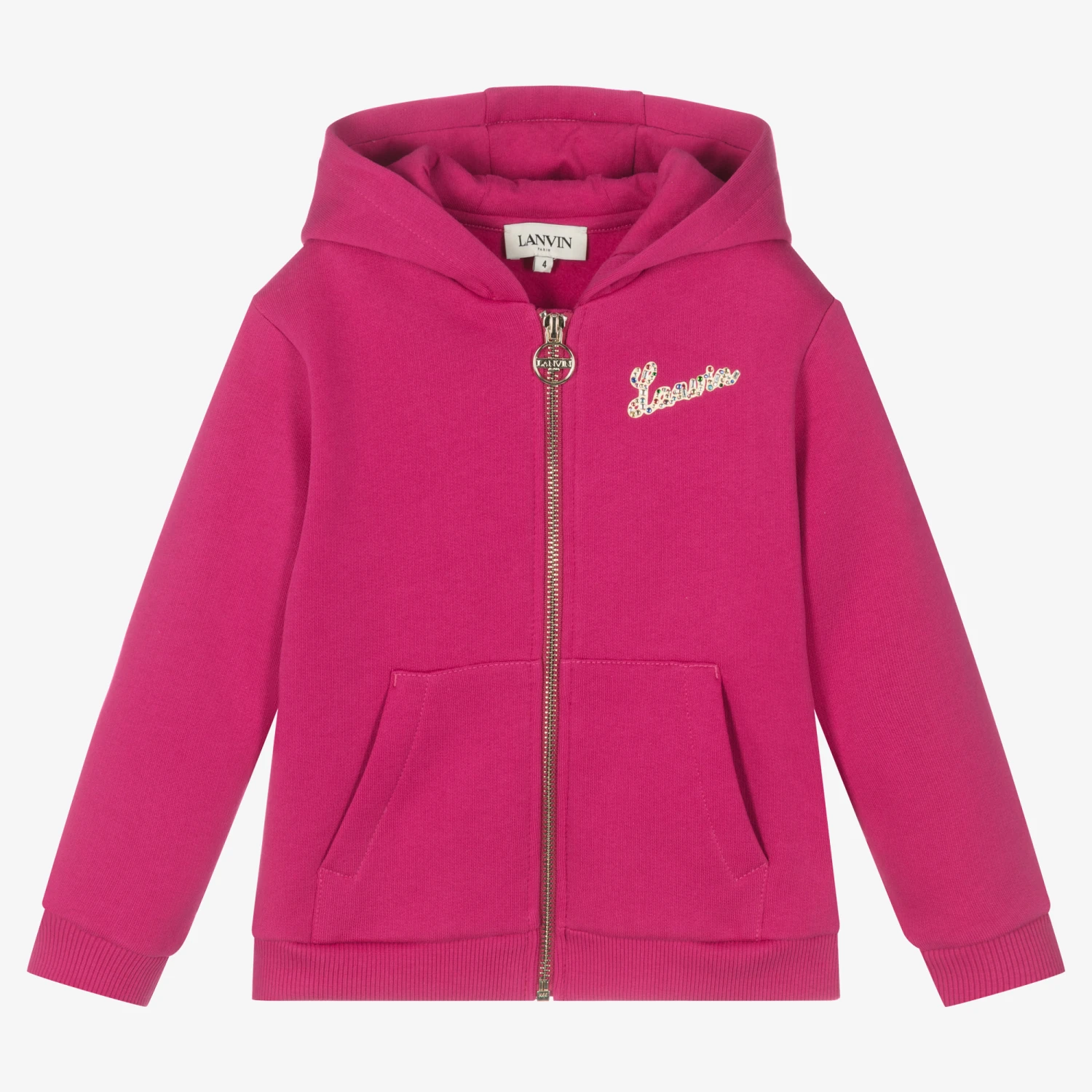 Fuchsia pink zip-up hoodie for girls by French designer Lanvin, made in eco-friendly organic cotton jersey. Featuring a colourful diamanté logo on the chest, it has stretchy ribbed trims, and a shiny gold zip pull for a glamorous finishing touch.