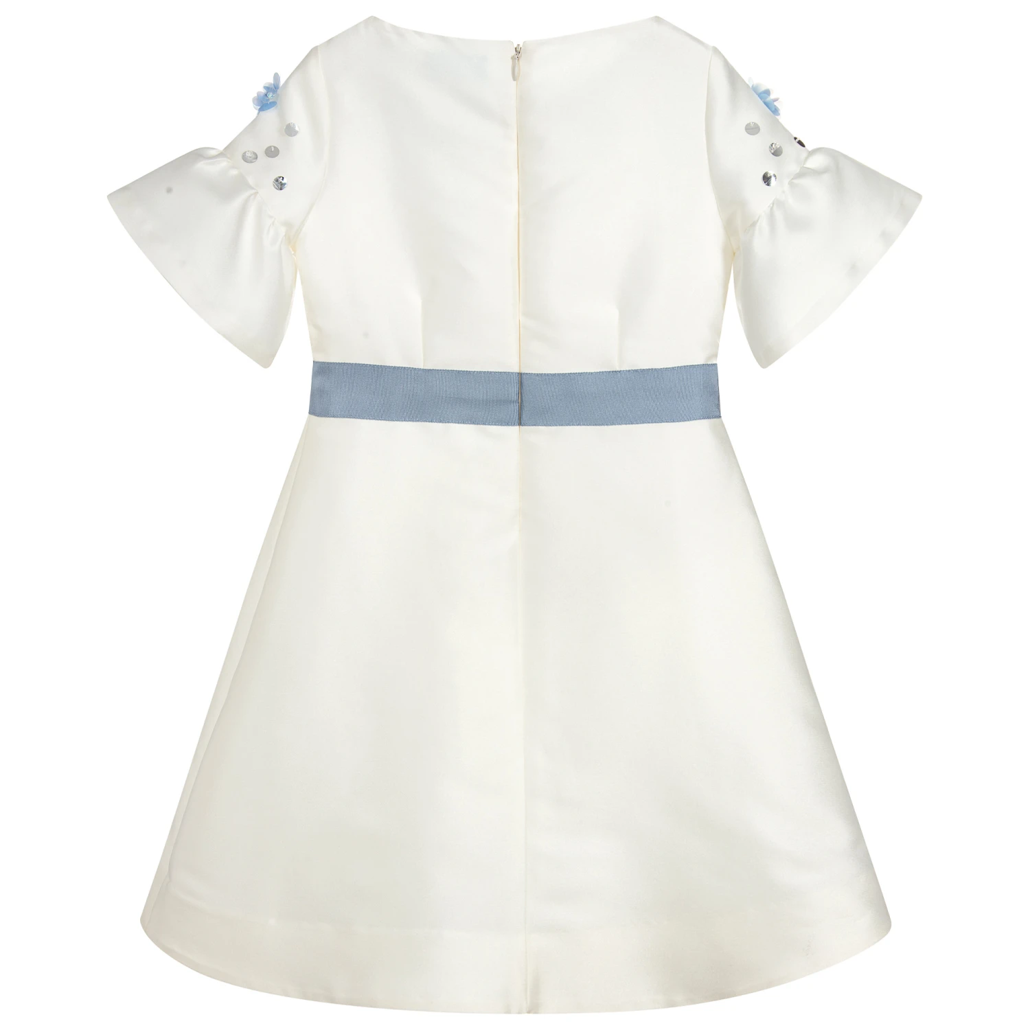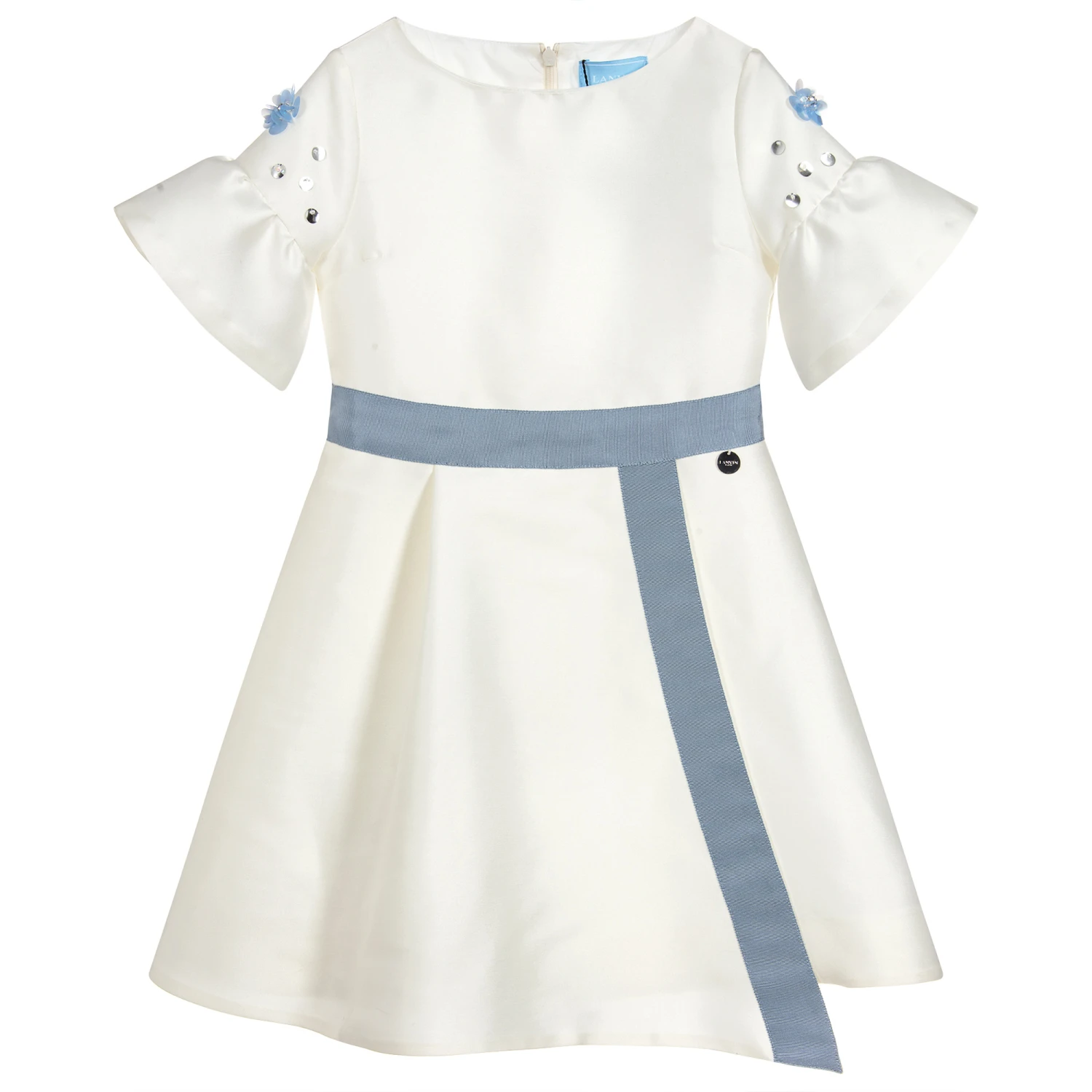 Luxury brand Lanvin’s ivory satin dress for girls with a metal logo tab on the waist, has a wrap over pleated panel on the front with blue-grey trim. The pretty bell shaped sleeves have blue and silver sequin and crystal flowers. It is made in a soft, silk and polyester blend, and is fully lined for comfort in soft cotton.