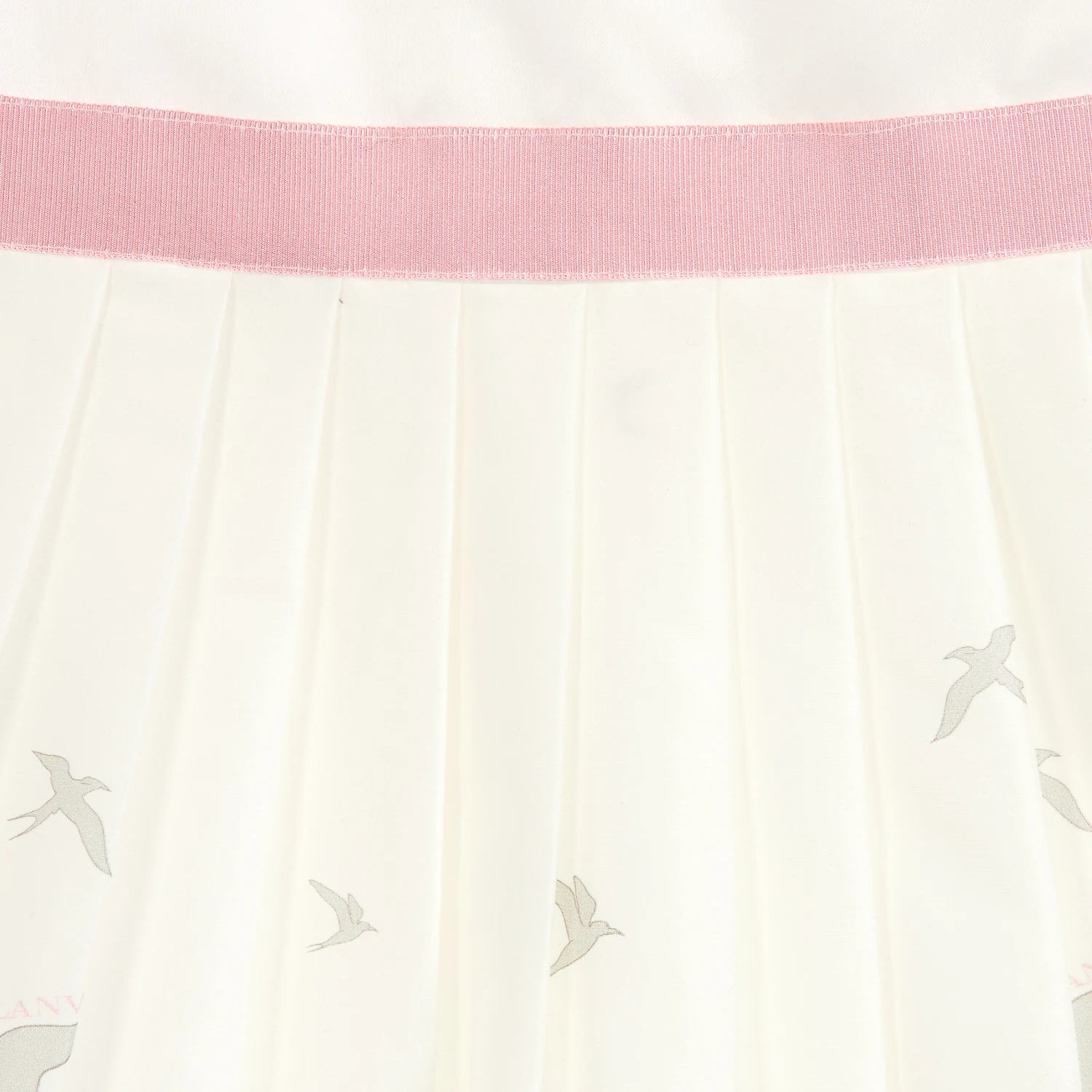 A pretty, ivory and pink, special occasion dress for girls, by luxury brand Lanvin. Made in a soft, lightweight cotton and silk blend, and fully lined in cotton, it has sheer organza sleeves and crystal buttons on the cuffs. Tiny pink logos are scattered amongst an enchanting pink and grey woodland scene.
