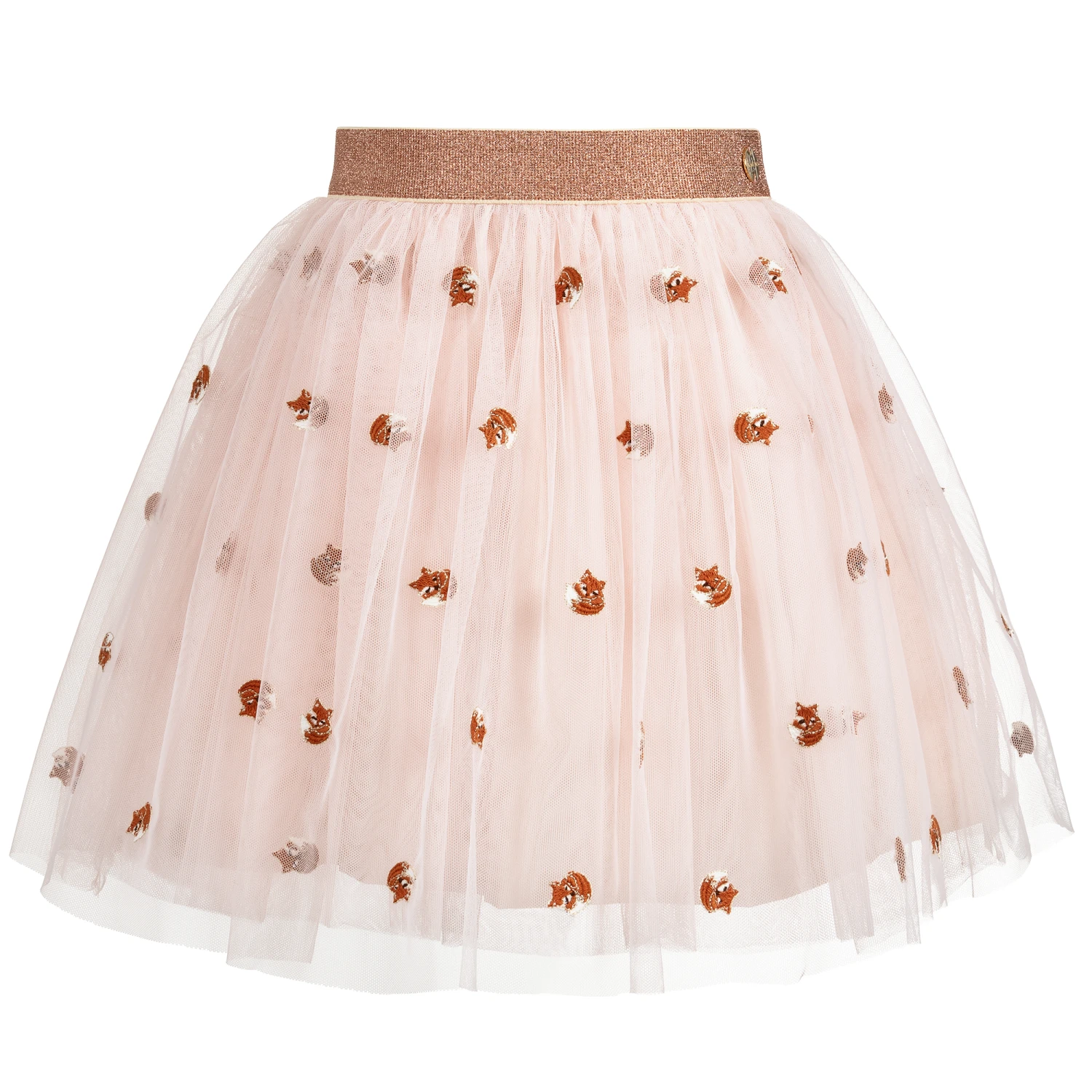 A pretty pale pink skirt with embroidered foxes for girls by Lanvin, made in layers of soft tulle. It has a sparkly pink elasticated waistband, and is lined in a pink soft, comfortable cotton.