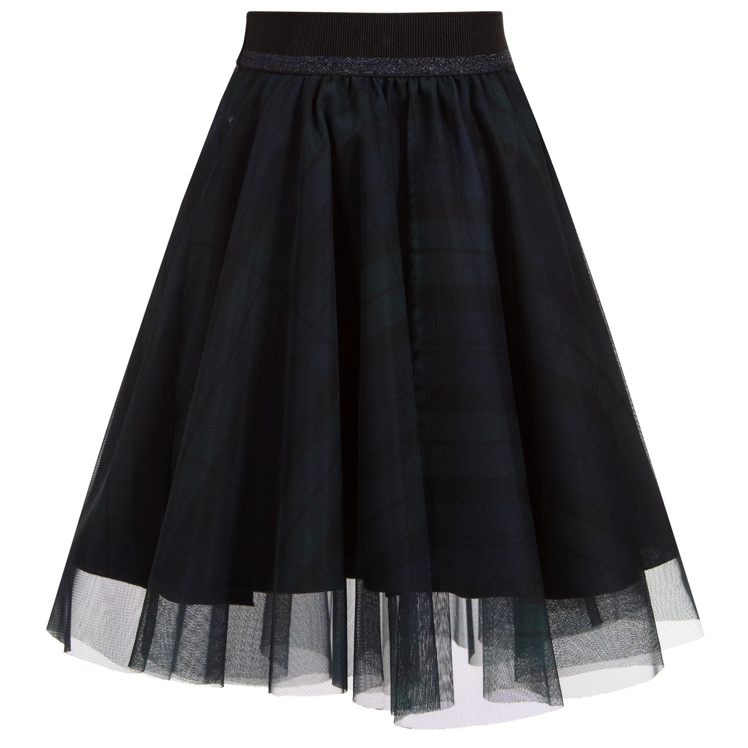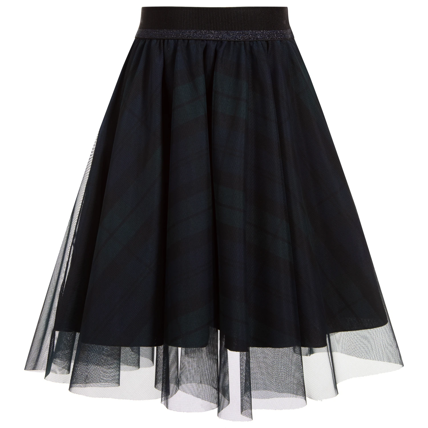 Girls navy blue, green and black tartan skirt from Lapin House, made in soft tulle. It has a mid-weight cotton lining and an elasticated waistband, with sparkly navy blue trim.