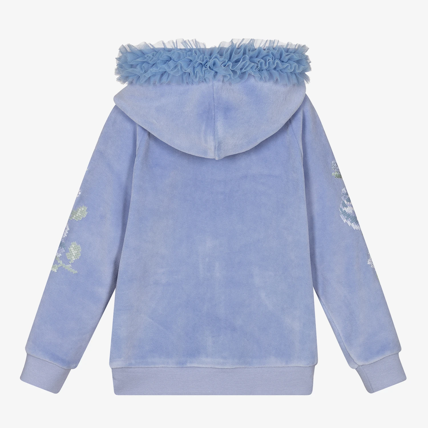 In a lovely shade of cornflower blue, a hooded zip-up top for girls from Lapin House. Made in soft cotton velour, it has ruffled tulle trim on the hood, blue floral print on the sleeves, and front pouch pockets.
