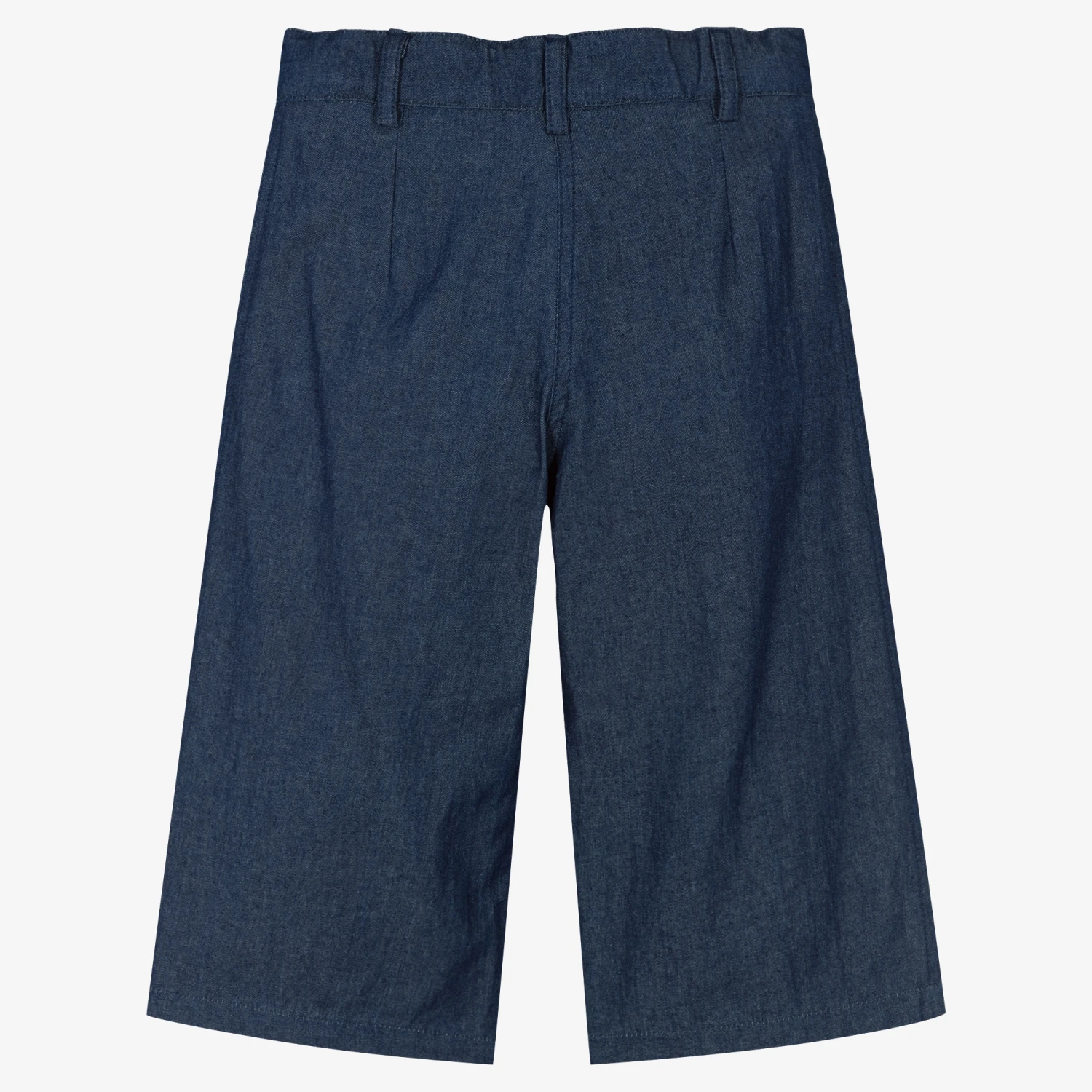 Deep blue culottes for girls by Lapin House, woven in lightweight cotton chambray. In a wide-leg style, they have a comfortable adjustable waist and smart pleats on the front for a tailored finish.