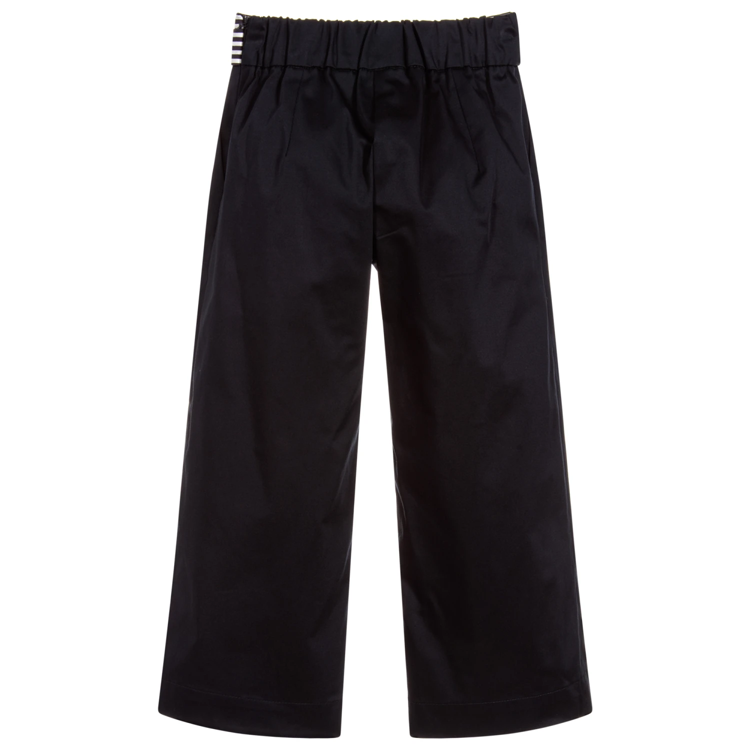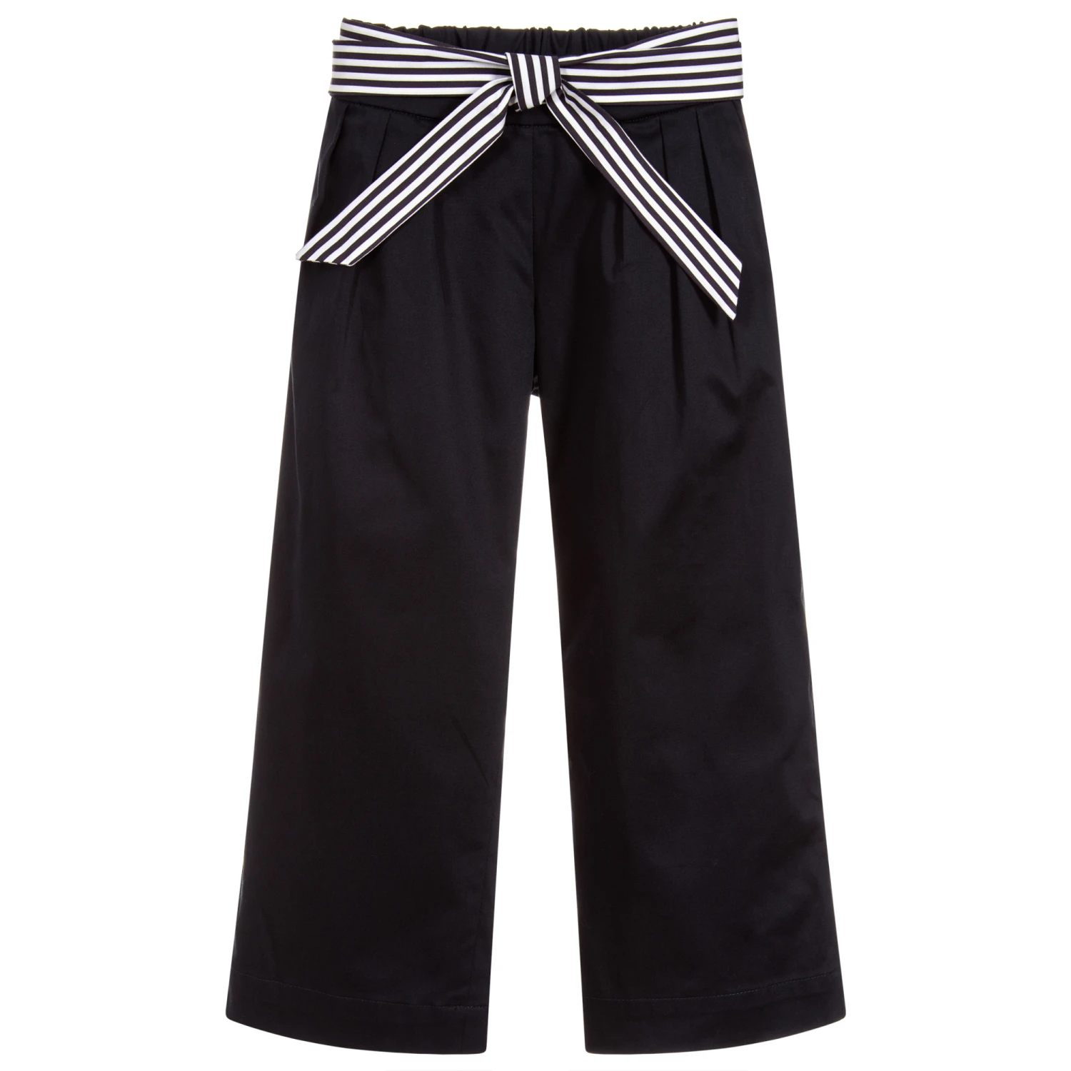 Girls navy blue cotton culottes from Lapin House. These wide-legged trousers are made in stretch cotton twill and have an elasticated waistband, with an attached blue striped bow belt.
