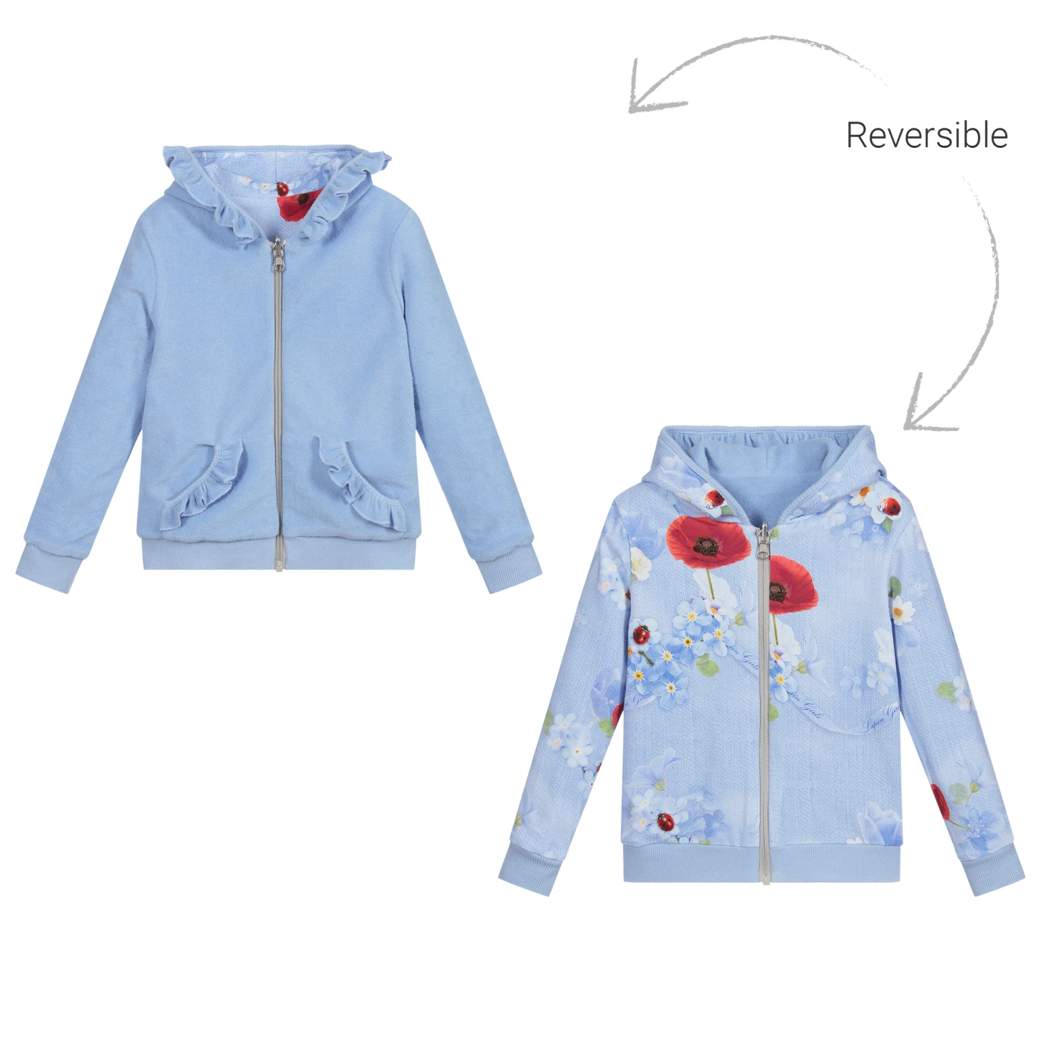 Blue hooded zip-up top for girls by Lapin House. Reversible, the plain blue side is made in soft cotton towelling, while the floral-patterned side is in soft jersey. The towelling side has pretty ruffle trim on the pockets and hood.