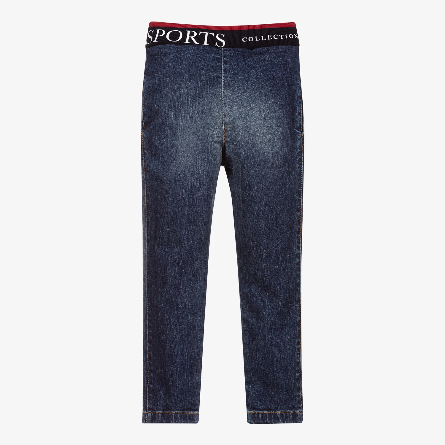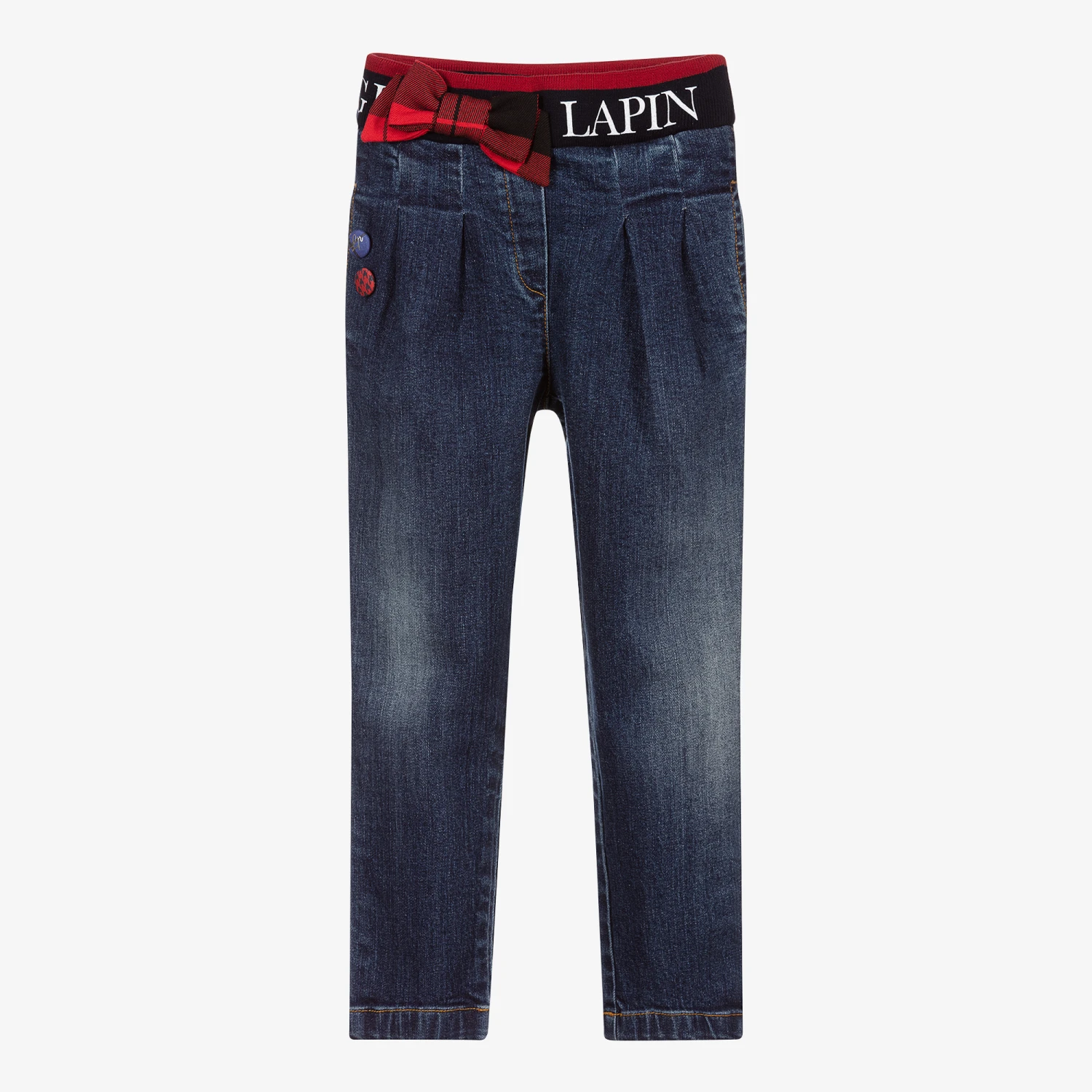 Blue jeans for girls by Lapin House, made in washed and worn look denim. They have a navy blue and red striped elasticated waistband with a glittery white logo and a fixed tartan bow. There are pleats on the front, decorative blue and red logo buttons, and concealed side pockets.