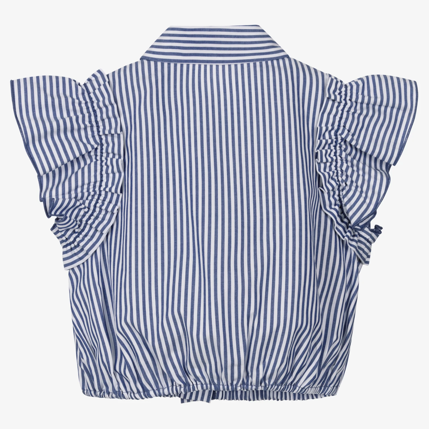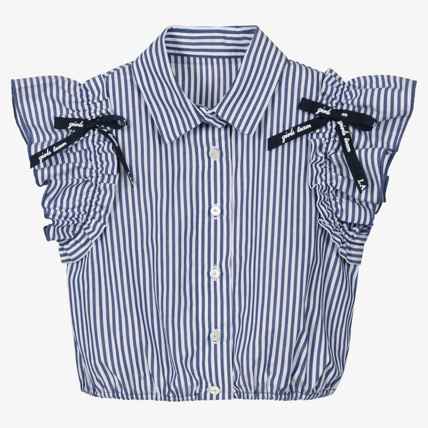 Gorgeous navy blue and white striped blouse for girls, by Lapin House. Made in soft cotton poplin, it has girly flutter sleeves and blue logo bows with an added sparkly touch. The hem is elasticated for a cute puffed effect and it has a smart pointed collar. It fastens with easy buttons on the front, finished with sparkling diamanté to tie the look together.