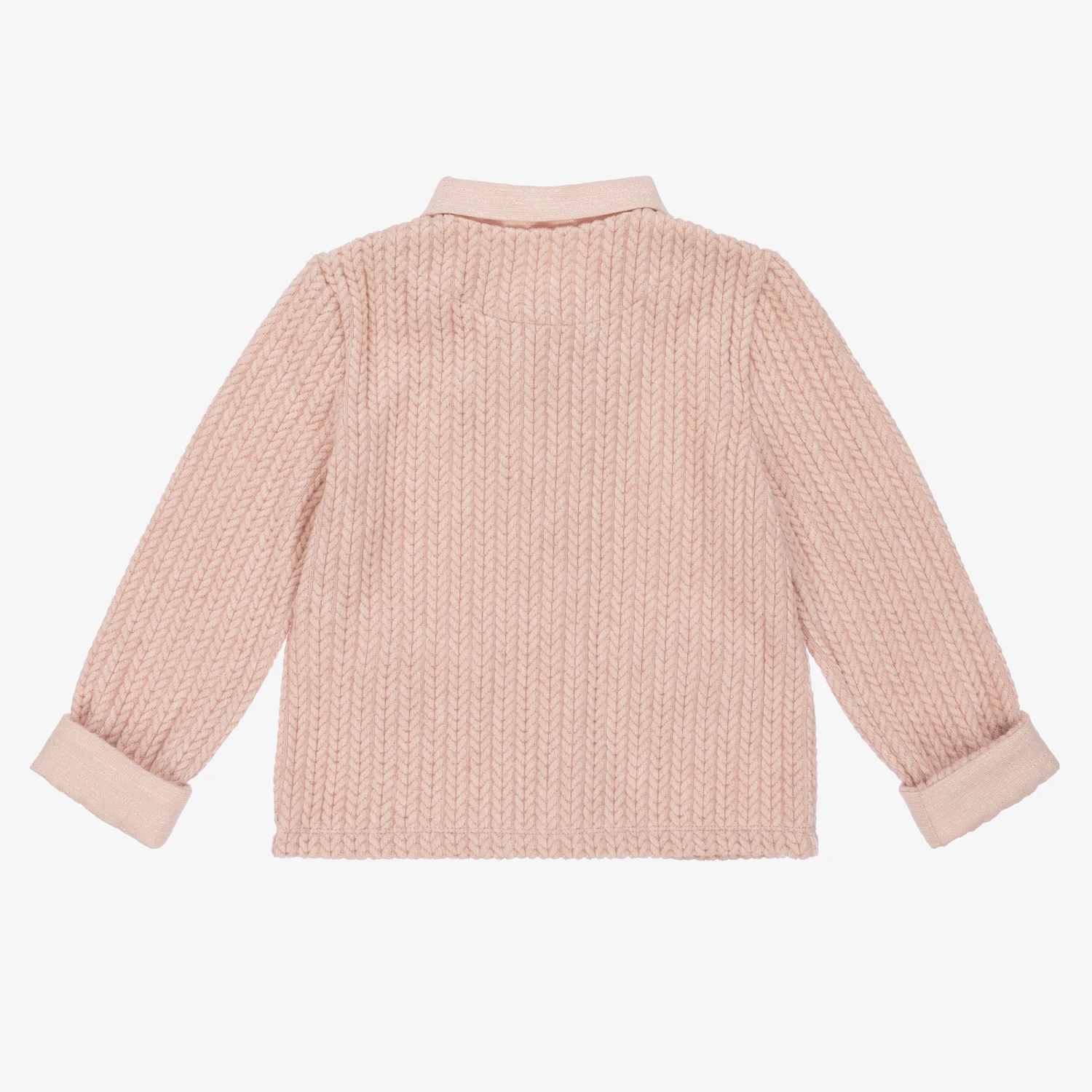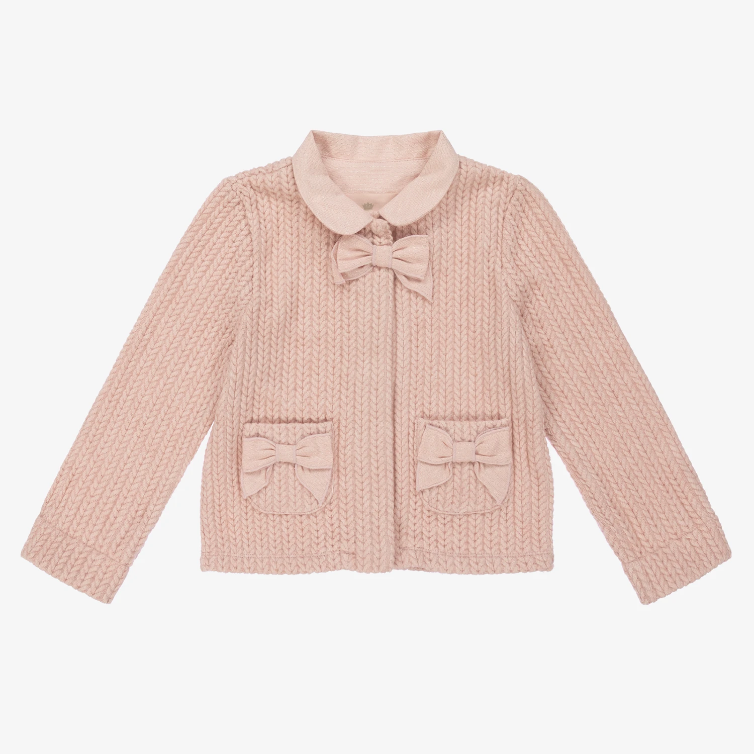 A pretty pale pink knitted cardigan for girls by Lapin House, with a glittering pink collar and sweet bows. It is made in a super soft, mid-weight viscose blend, in a smart cable-style knit design. There are popper fastenings and pockets on the front.