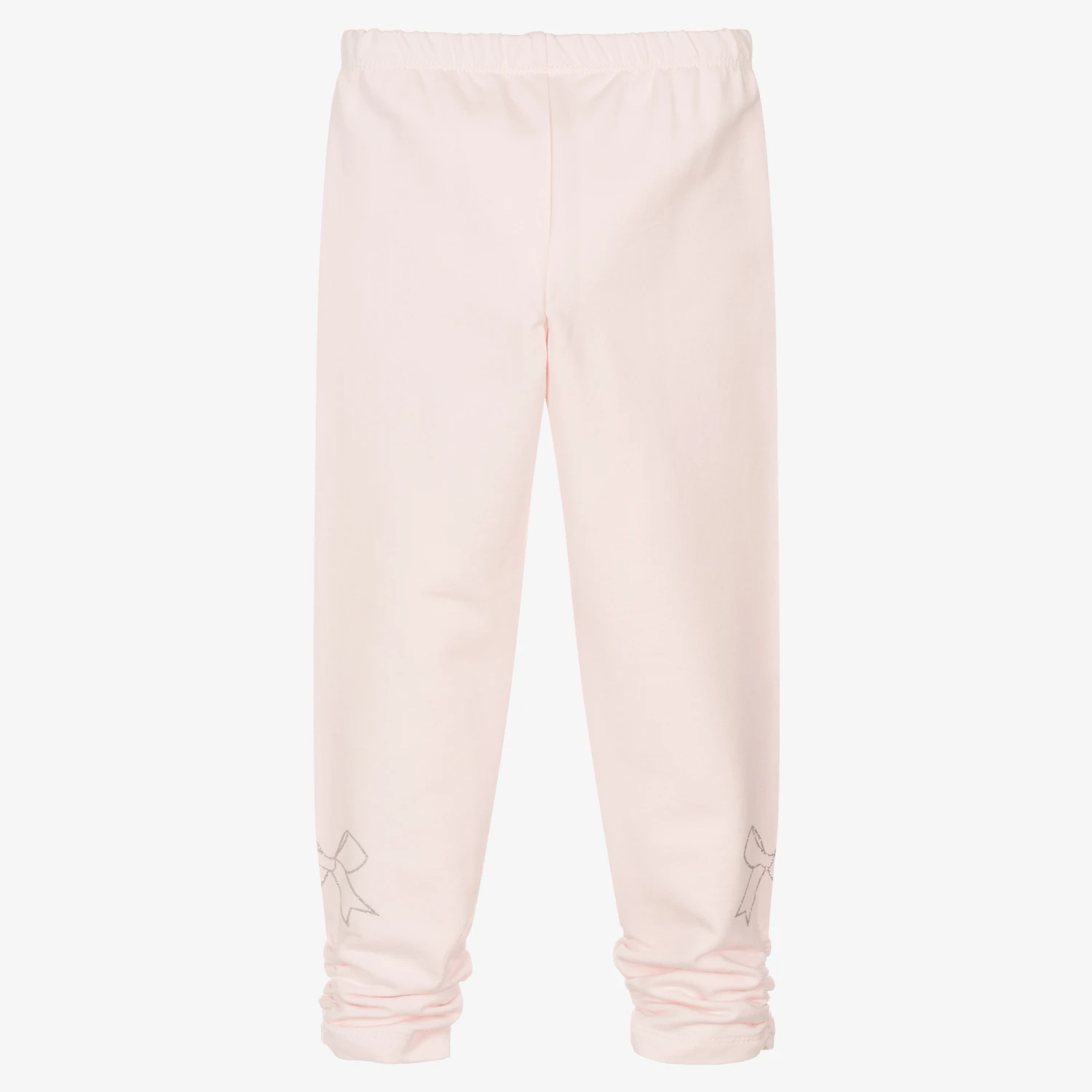 Cute pale pink leggings for girls, by Lapin House. Made in soft cotton jersey, they have a sweet silver sparkly bow print on the sides, and pretty ruched cuffs.