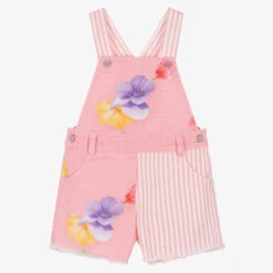 Pink denim short dungarees for girls by Lapin House, made in soft twill with a slight stretch. These fun dungarees have a combination of a colourful floral, basket weave print and a striped pattern. For easy dressing, there are button fastenings on the sides and on the straps.