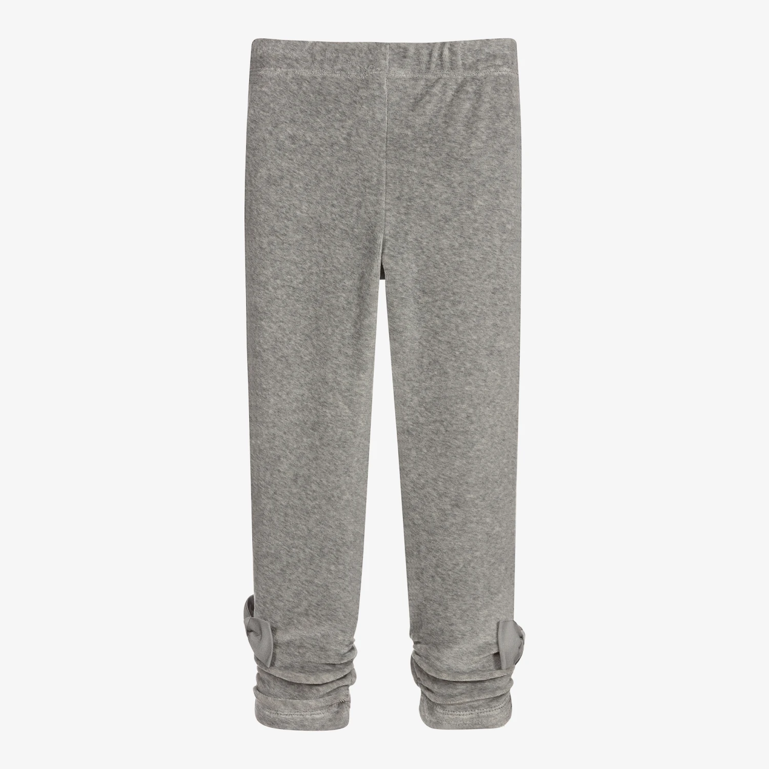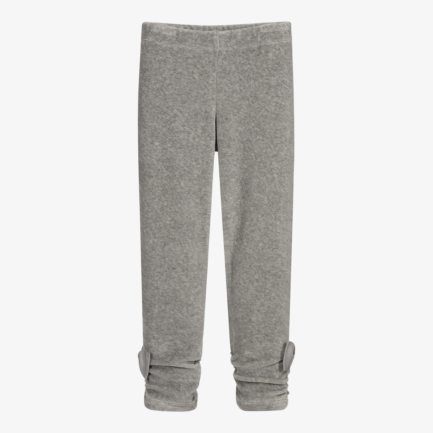 Grey leggings for girls by Lapin House, made in soft and stretchy velour. They have elasticated detailing at the ankles and grey grosgrain ribbon bow trims.