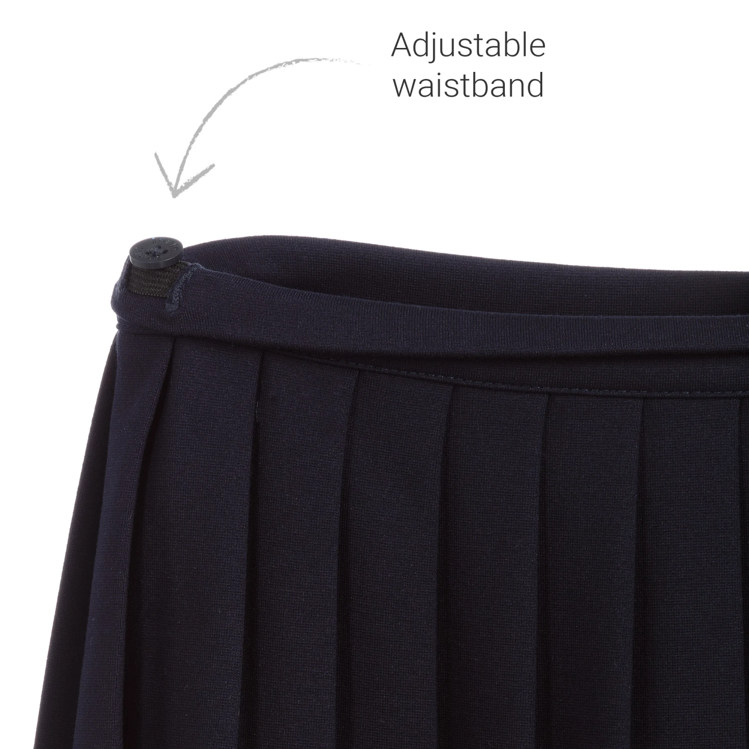 Girls lovely navy blue pleated skirt from Lapin House. It is made in super-soft and stretchy viscose jersey, with green, blue and red grosgrain ribbon trim. It has an adjustable waistband, and fastens with a zip and popper on the side.