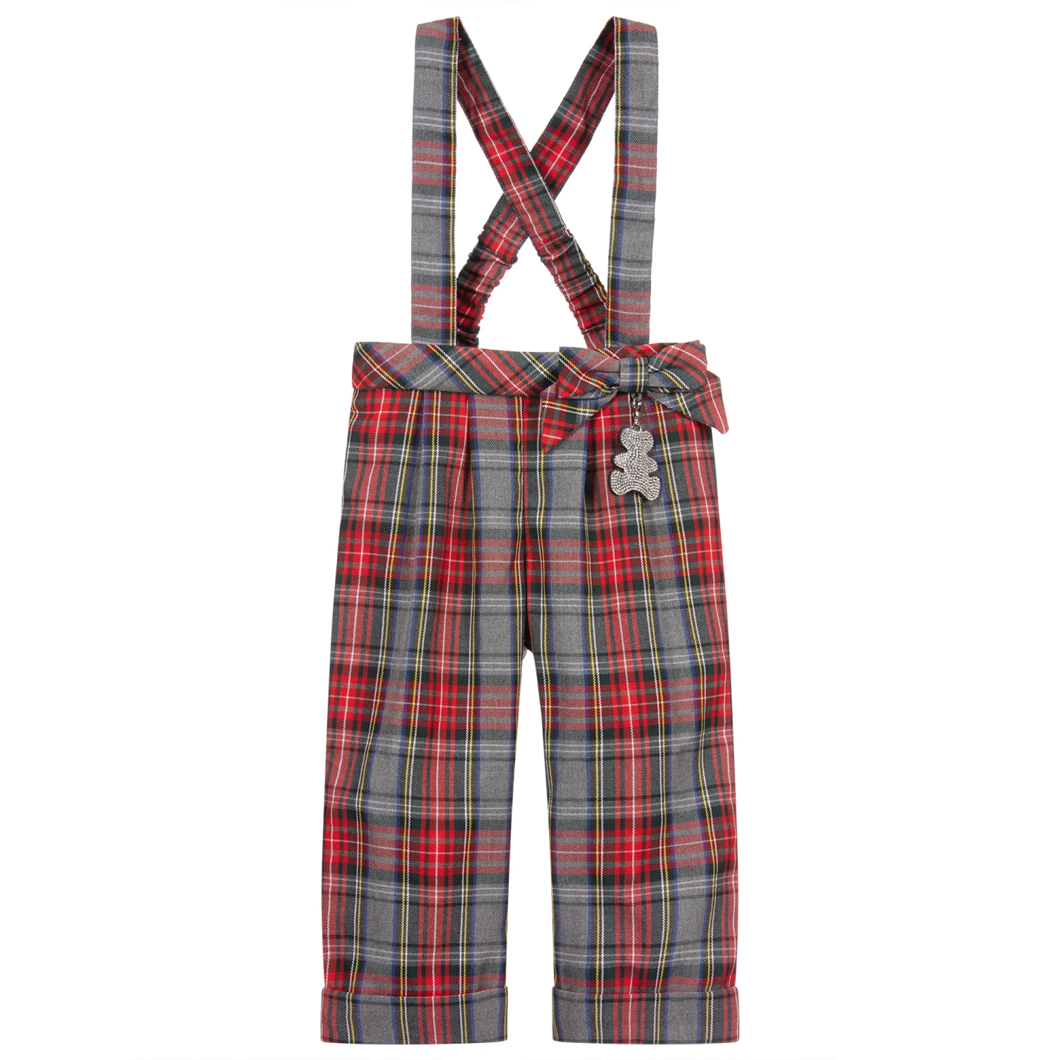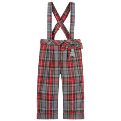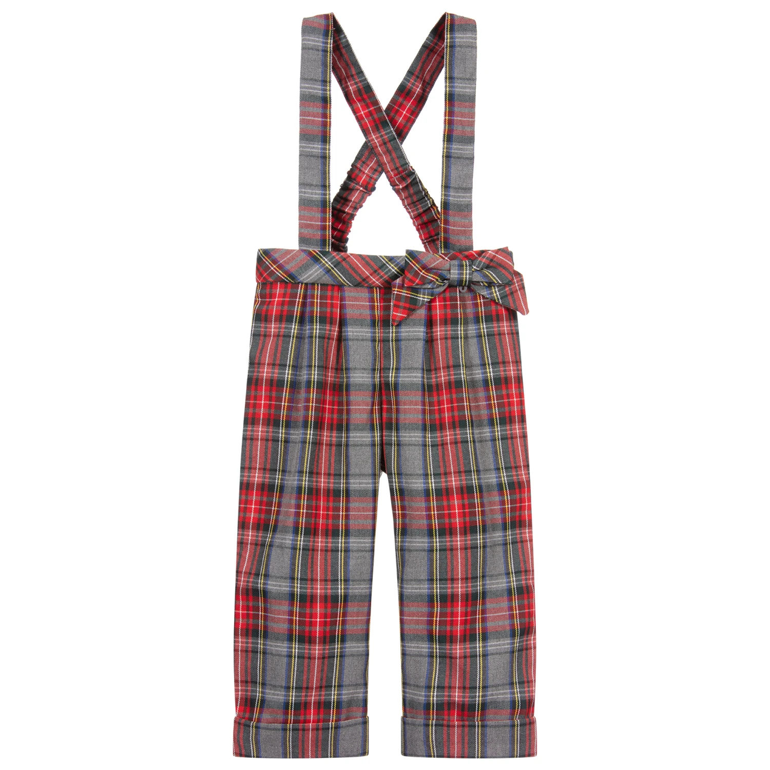 Girls grey and red tartan trousers from Lapin House, with adjustable shoulder straps. They are made in a soft, mid-weight viscose blend, with a side zip fastening. There is a bow on the elasticated waistband.