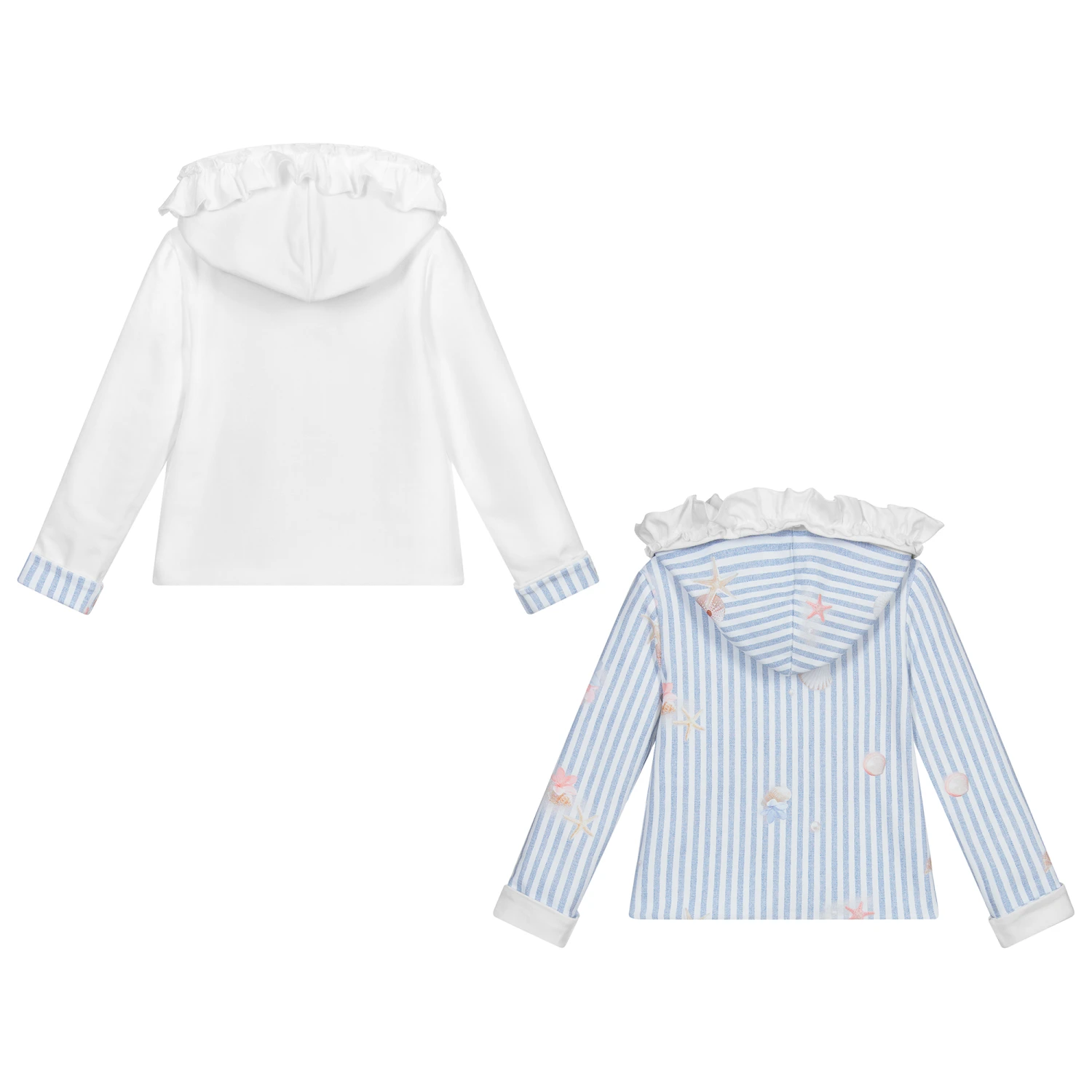 Reversible, hooded zip-up top for girls by Lapin House, made in soft cotton jersey. One side is plain white, with pockets and a ruffle trim on the front and around the hood. The other side has blue and white stripes with a pretty seashell print.