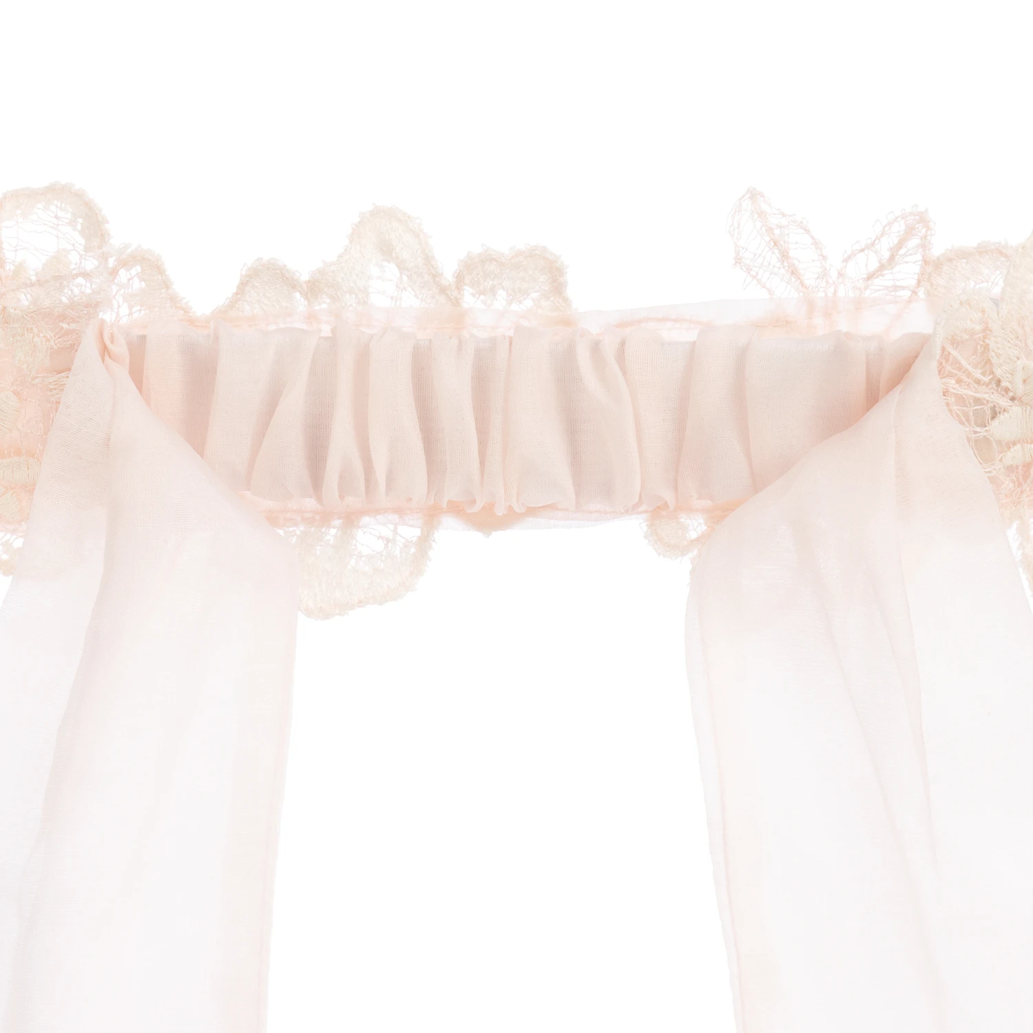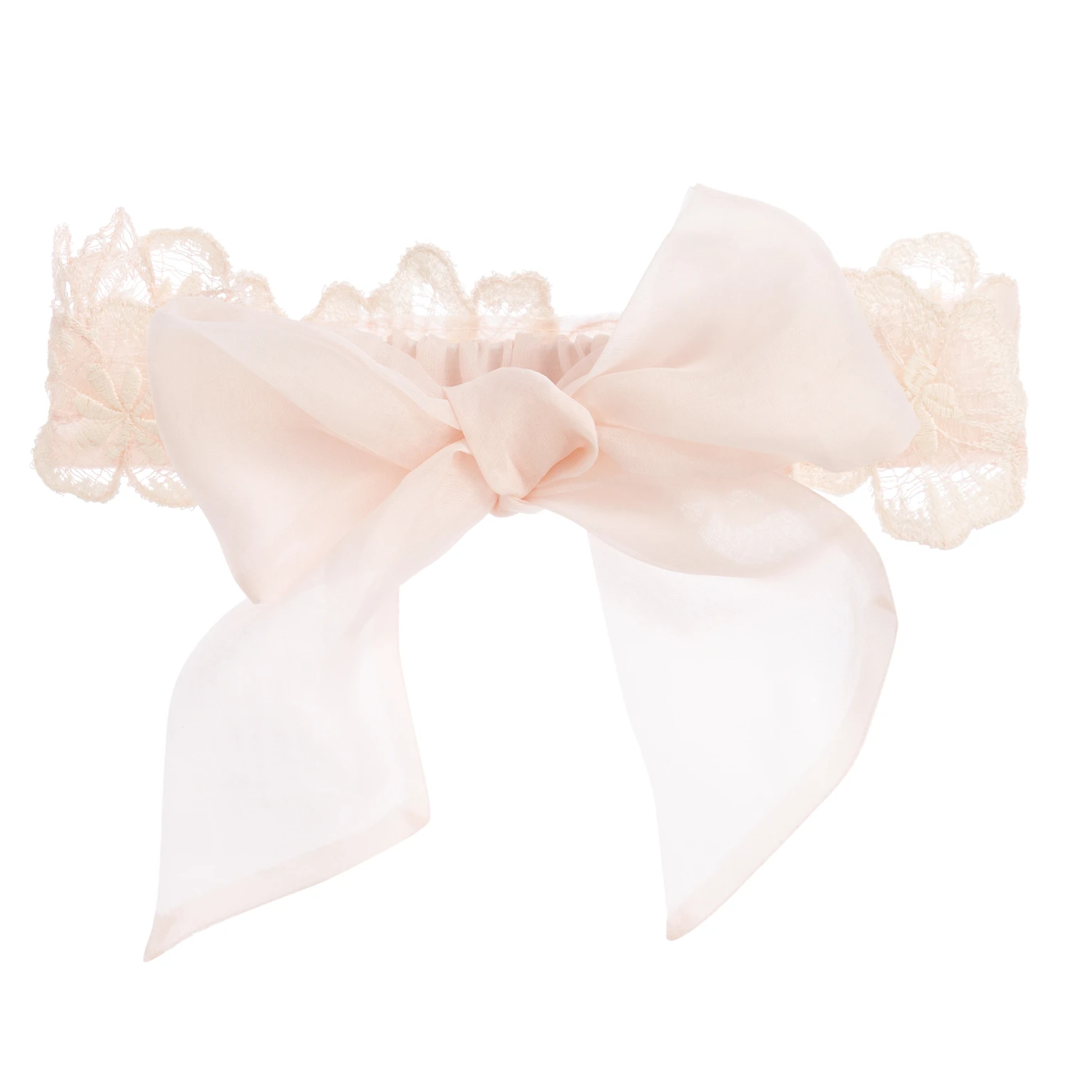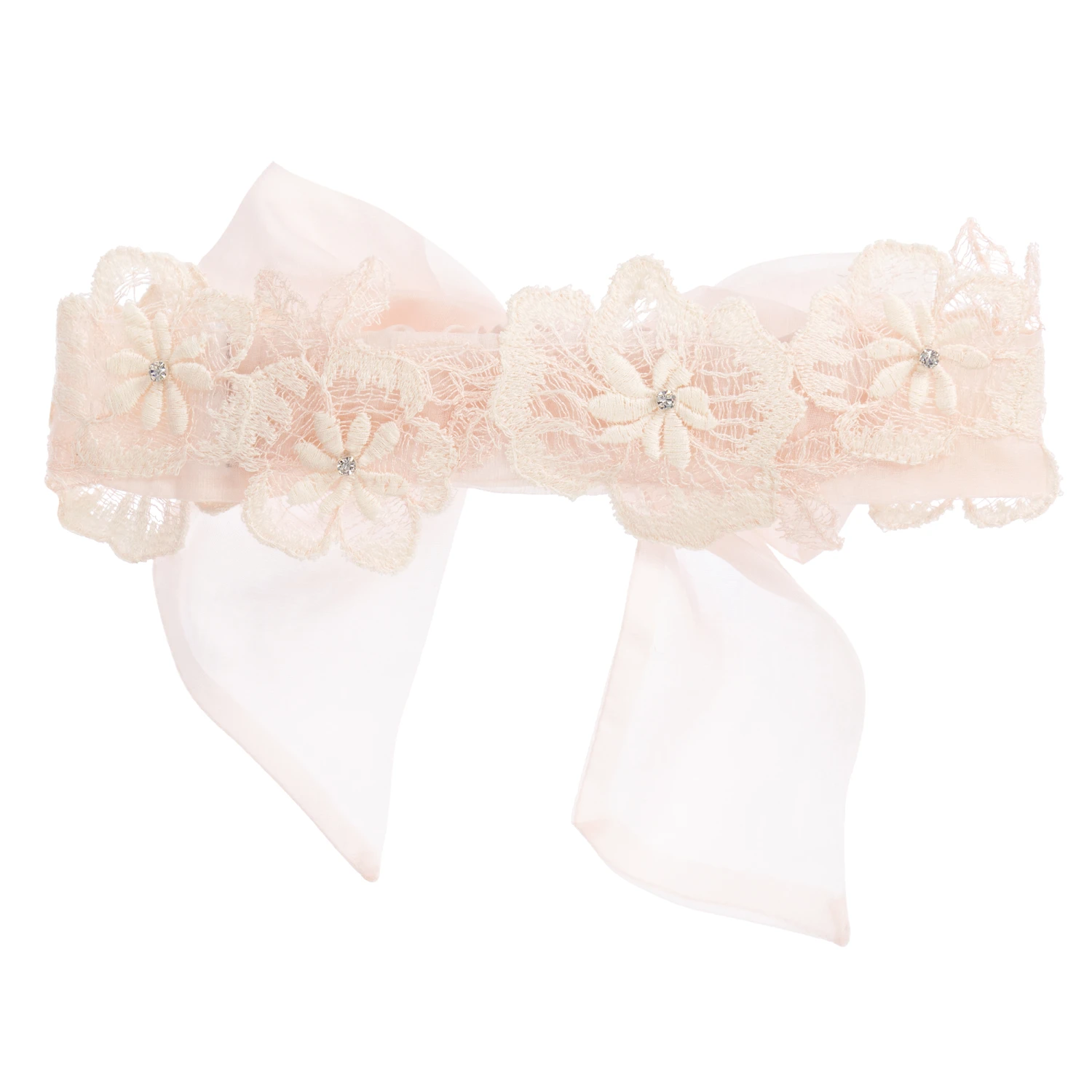 A beautiful pale pink silk chiffon and ivory lace headband for girls by Lapin House. It has delicate floral lace and diamanté crystals on sheer chiffon band which is elasticated on the back. There are two matching sash ties on the back of the head.