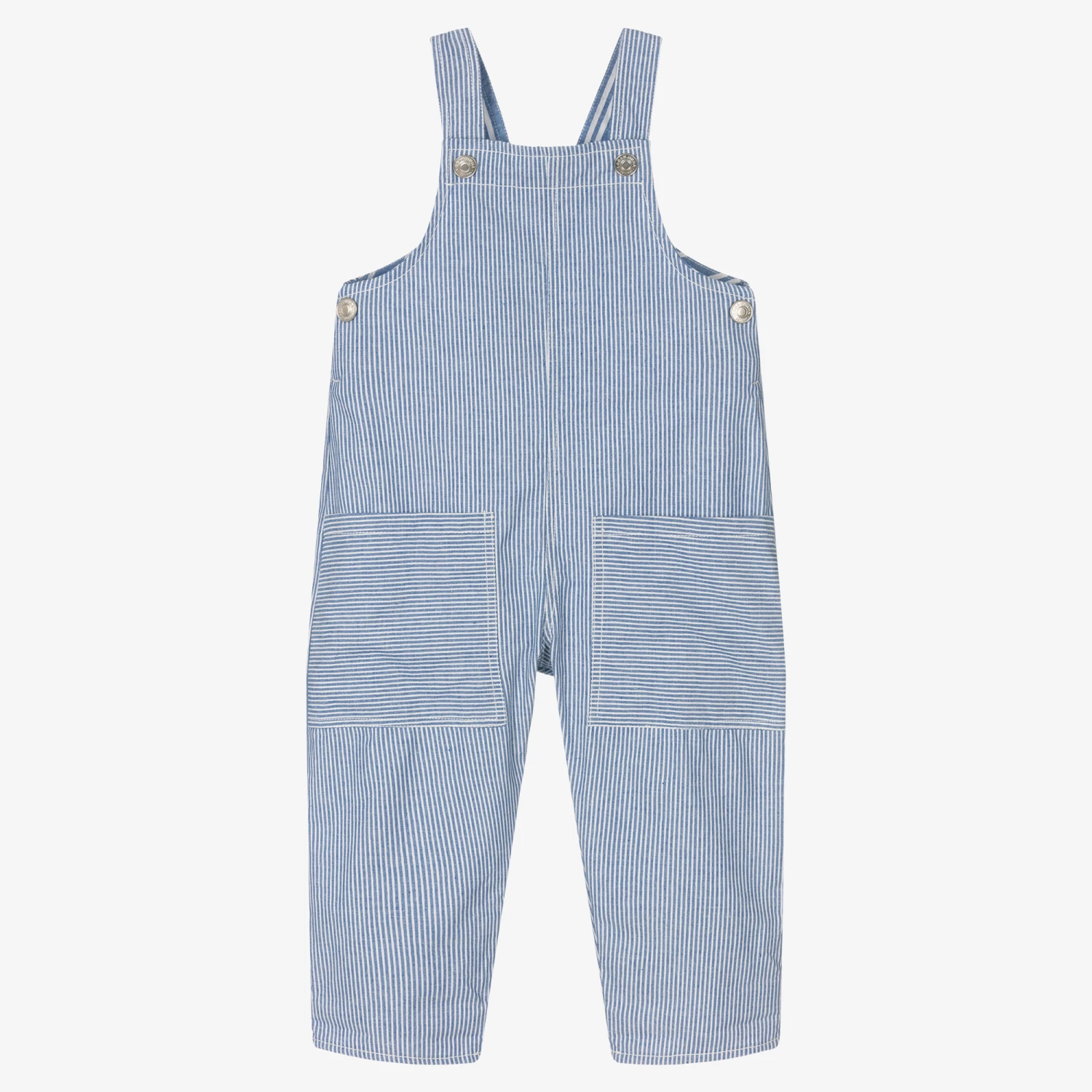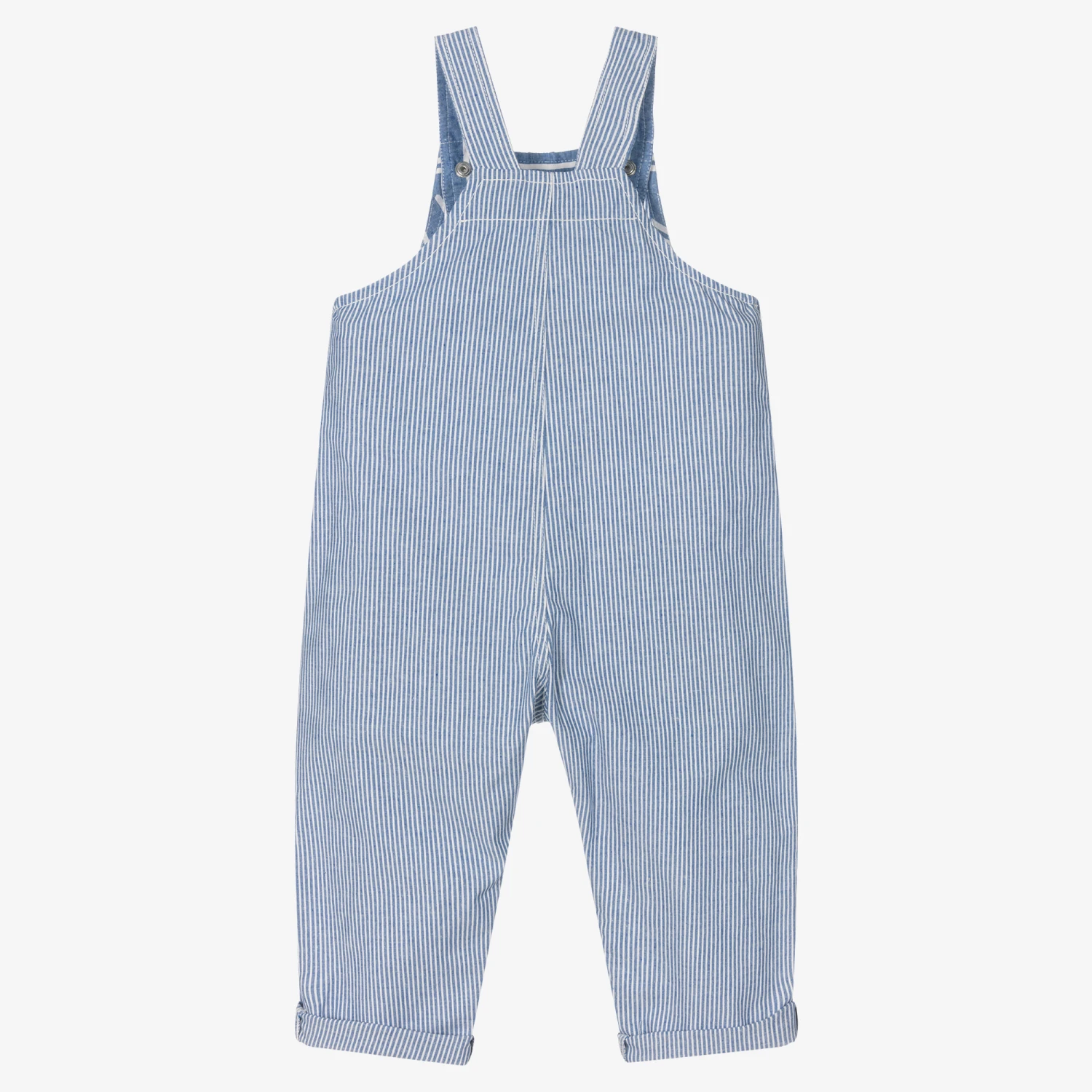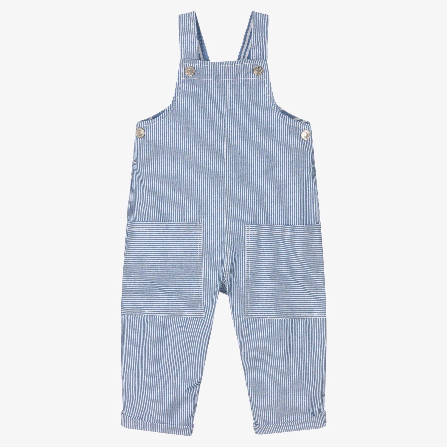 Gorgeous blue and white striped dungarees for boys and girls by Laranjinha. Made in a soft organic cotton blend, they have a relaxed fit for easy-to-wear style. They have branded poppers on the sides and adjustable shoulder straps for a comfortable fit. Large patch pockets complement the casual look and the legs can be rolled up.