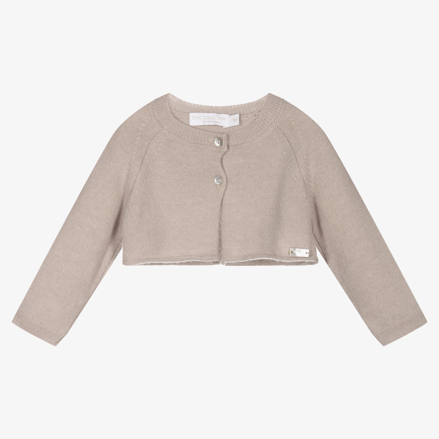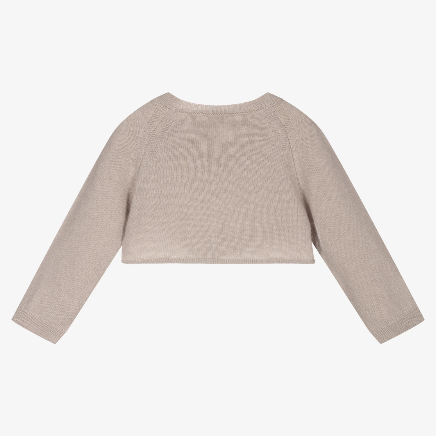 Grey-beige bolero cardigan for girls by Laranjinha, knitted in a soft Merino wool and cashmere blend. There are button fastenings and a logo plate near the hem, both in pretty mother-of-pearl.