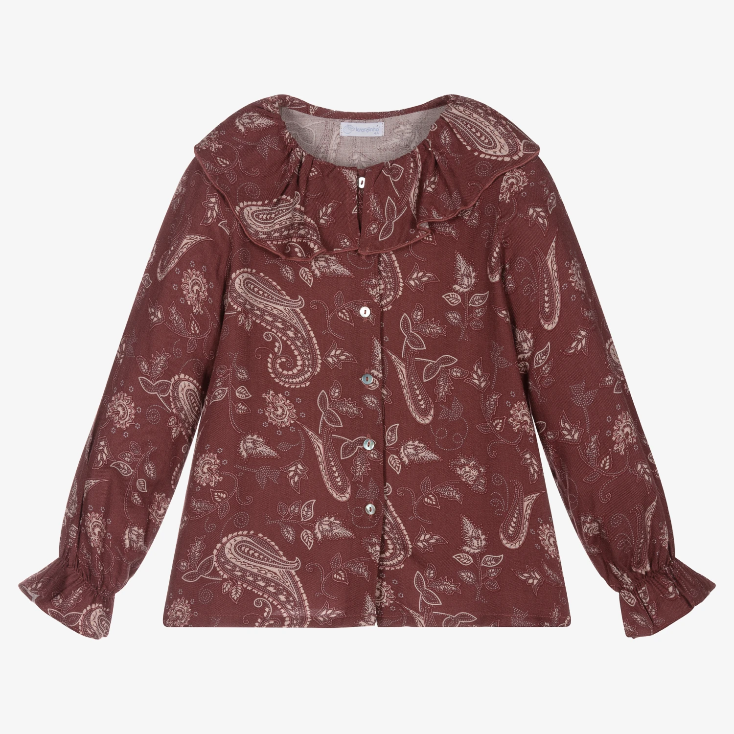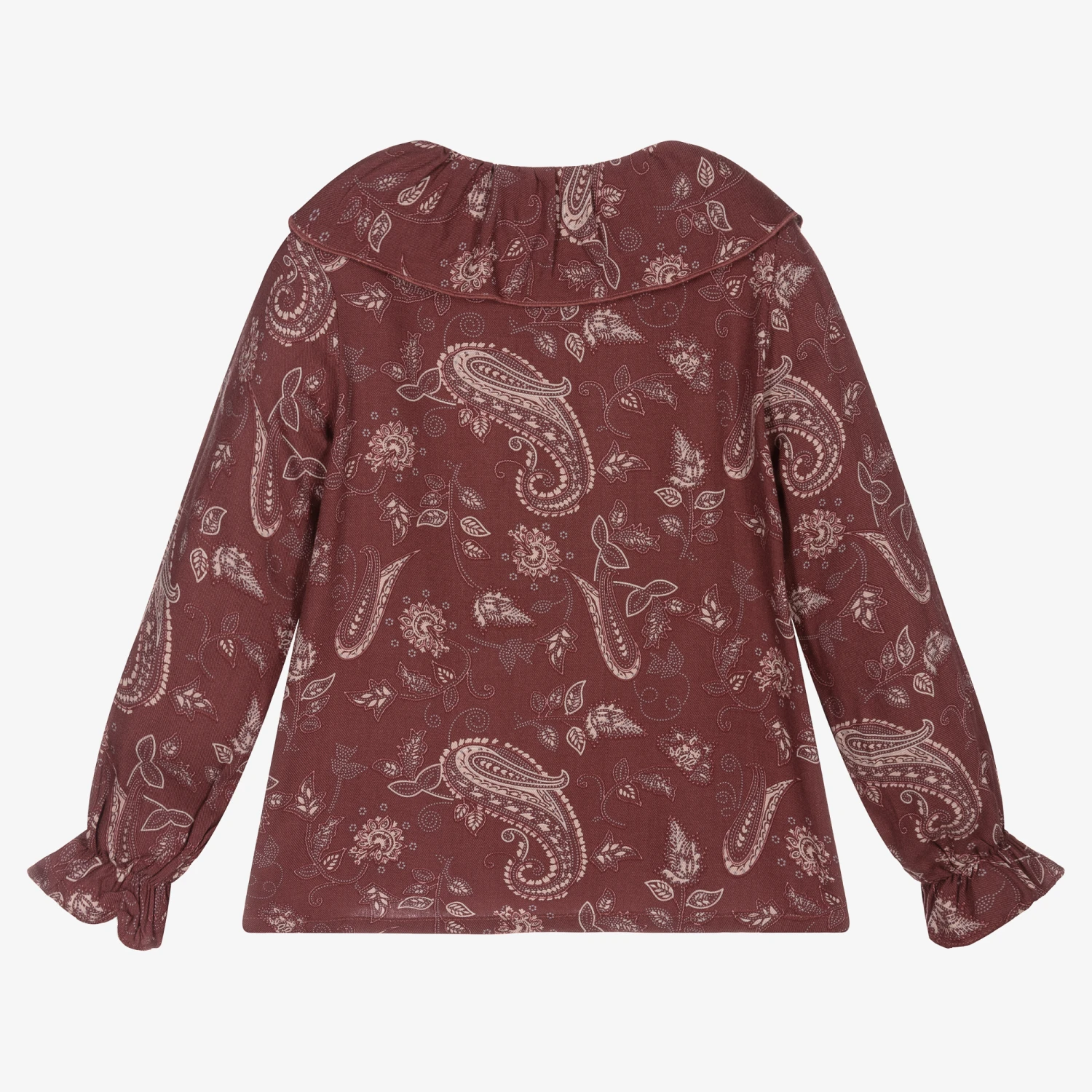 Girls burgundy red blouse from Laranjinha, with a grey and pink paisley pattern. Made in soft and lightweight viscose twill, it has a ruffled collar, elasticated cuffs and mother-of-pearl button fastenings.