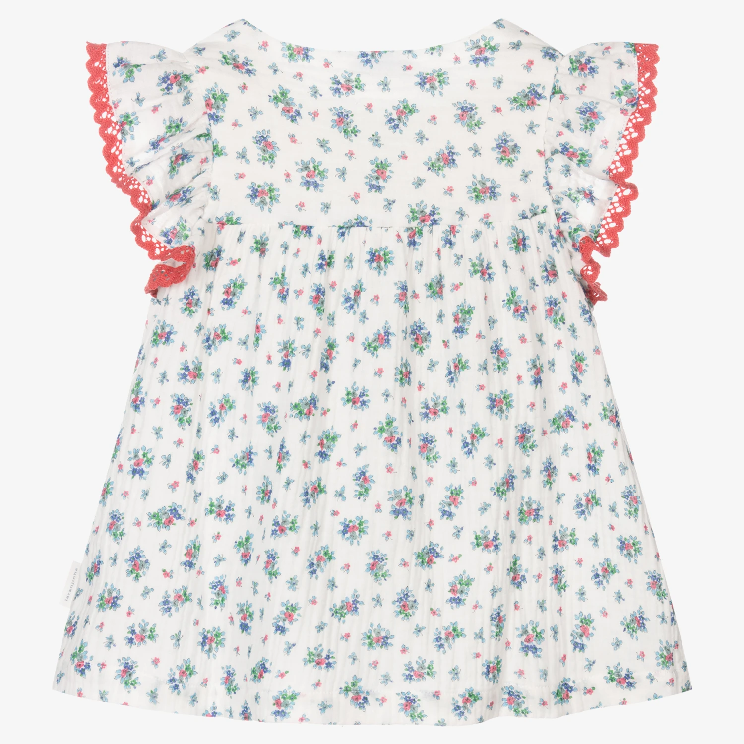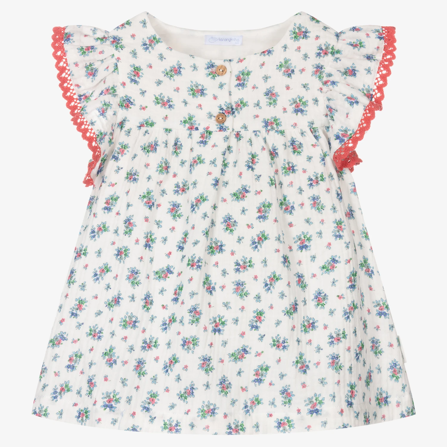 A charming white blouse for girls by Laranjinha, patterned in a pretty red, blue and green floral print. Made in soft cotton cheesecloth, it has feminine frilled sleeves, trimmed with red embroidered lace. It fastens with branded wooden buttons on the front for a traditional finish.