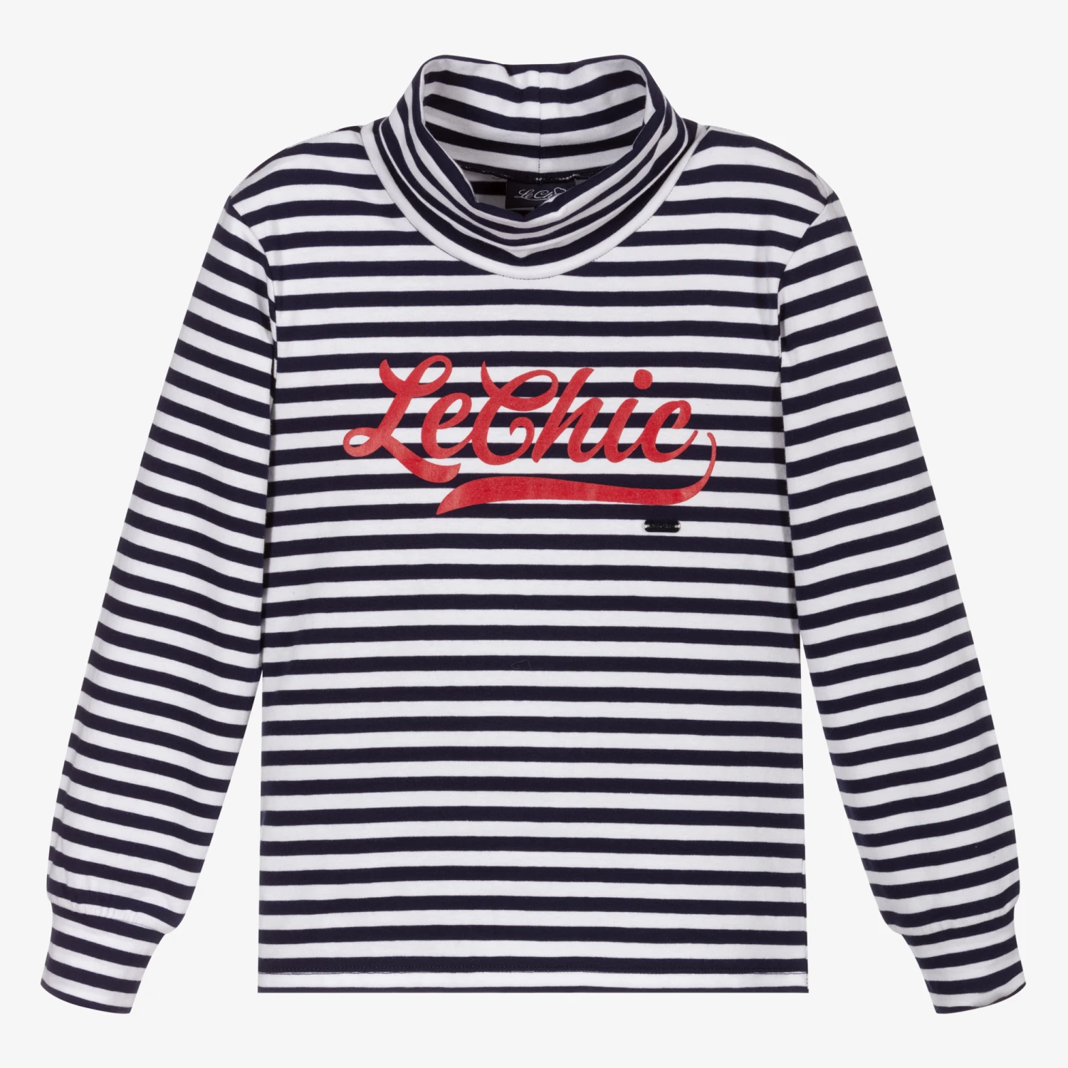 Navy blue and white striped roll neck top for girls by Le Chic. Made in soft cotton jersey, it has the brand’s logo printed across the chest in red, with a navy blue metal logo tab below.