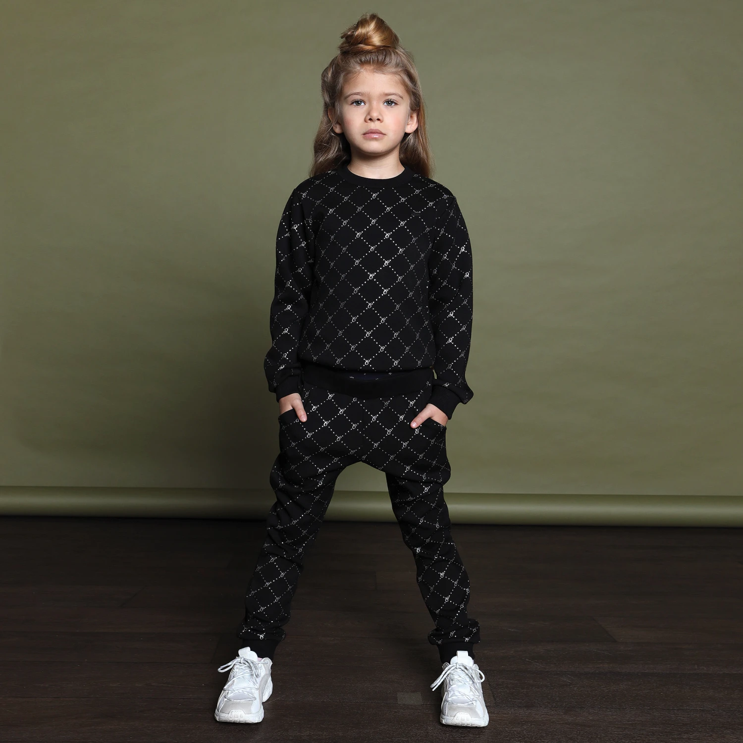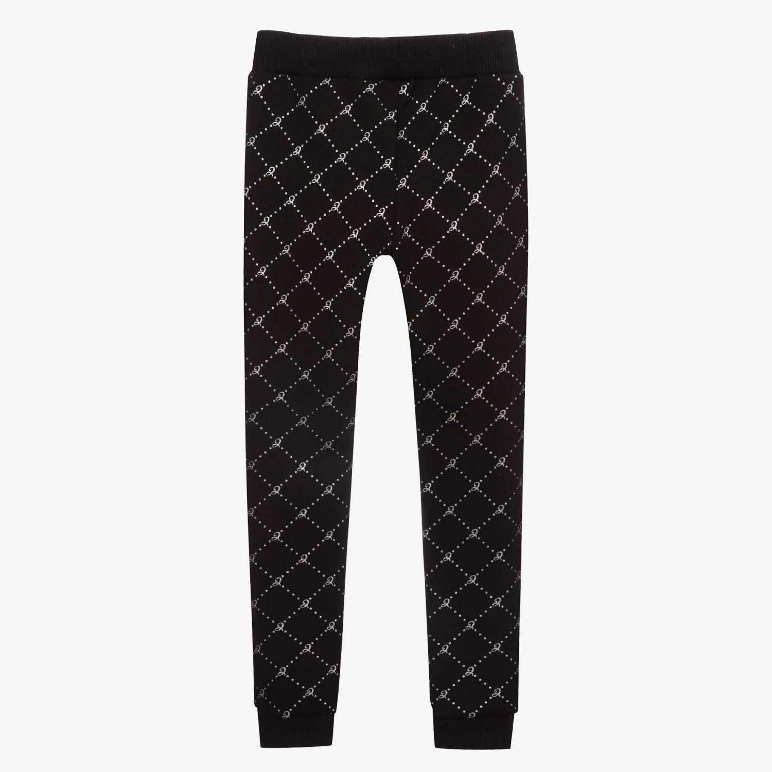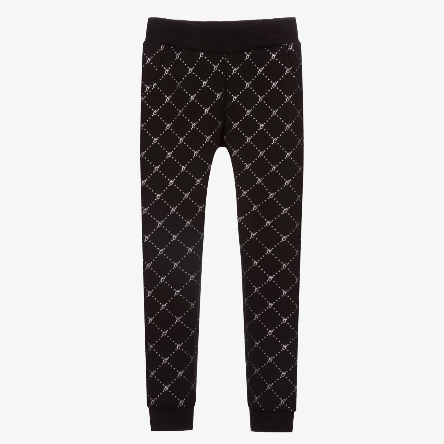 Girls black joggers from Le Chic, made in soft and stretchy polycotton jersey. They have a glittery silver diamond logo pattern and a black logo plaque on the front. The waistband and cuffs are ribbed, and there are two front pockets.