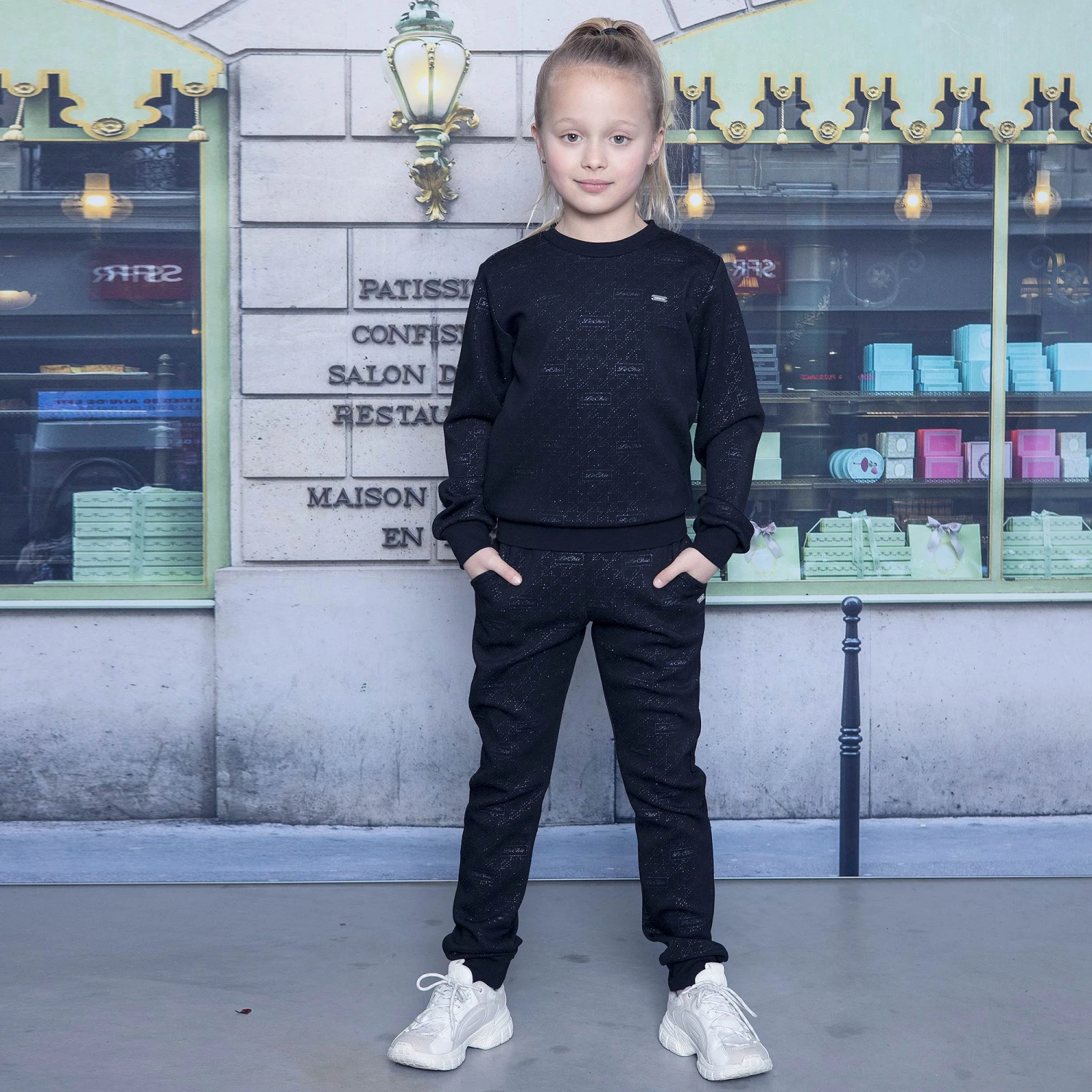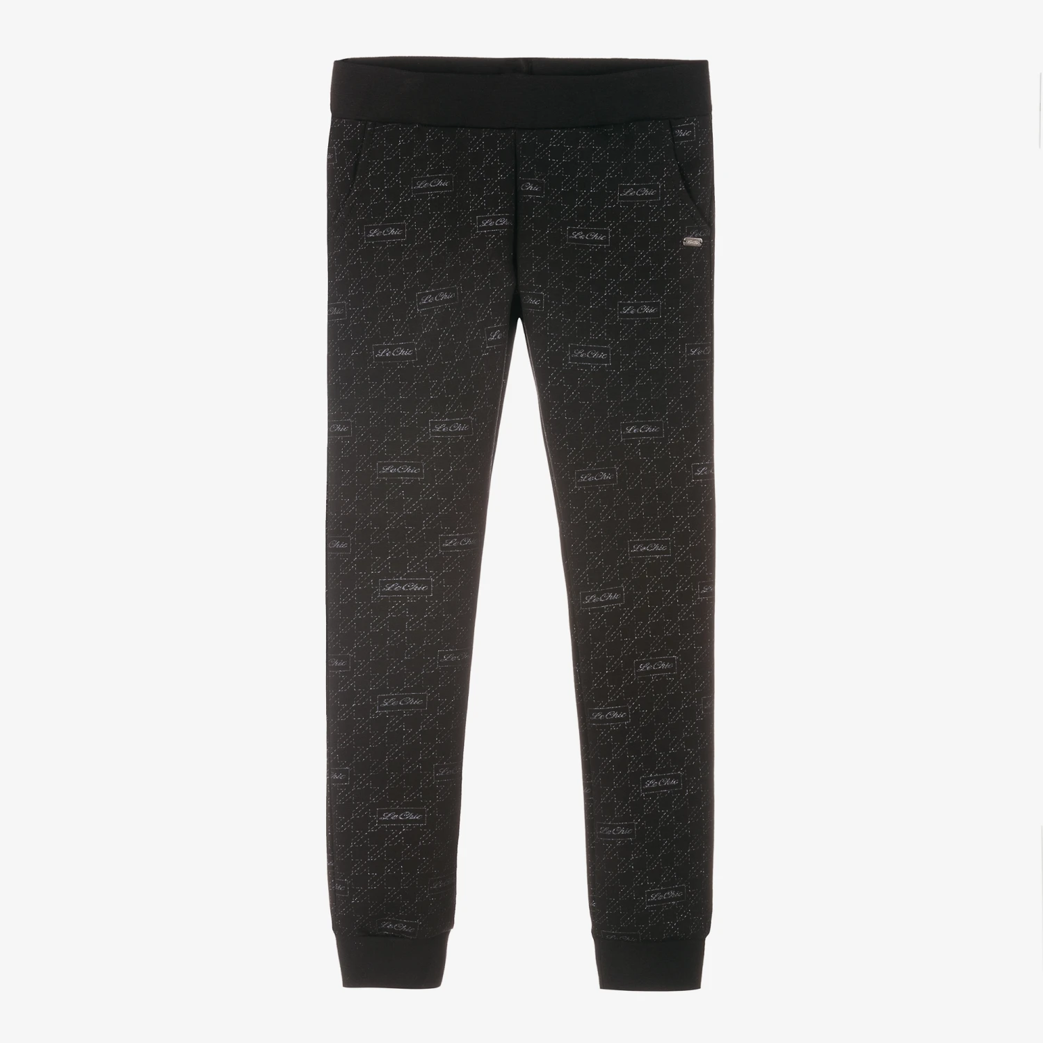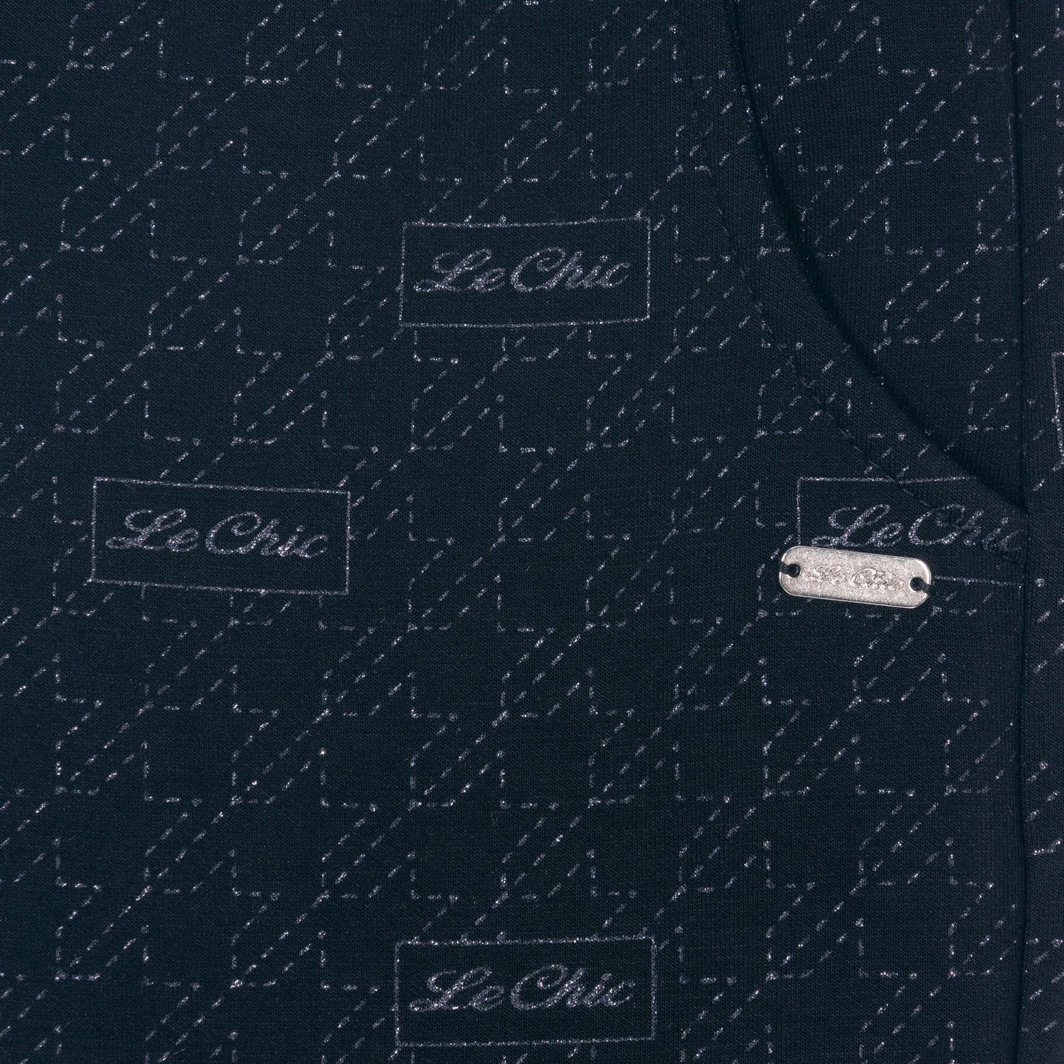 Navy blue joggers for girls by Dutch brand Le Chic. Made in lightweight jersey, they have a glittery geometric print with the designer’s logo. They have slanted front pockets and a comfortable elasticated waistband.