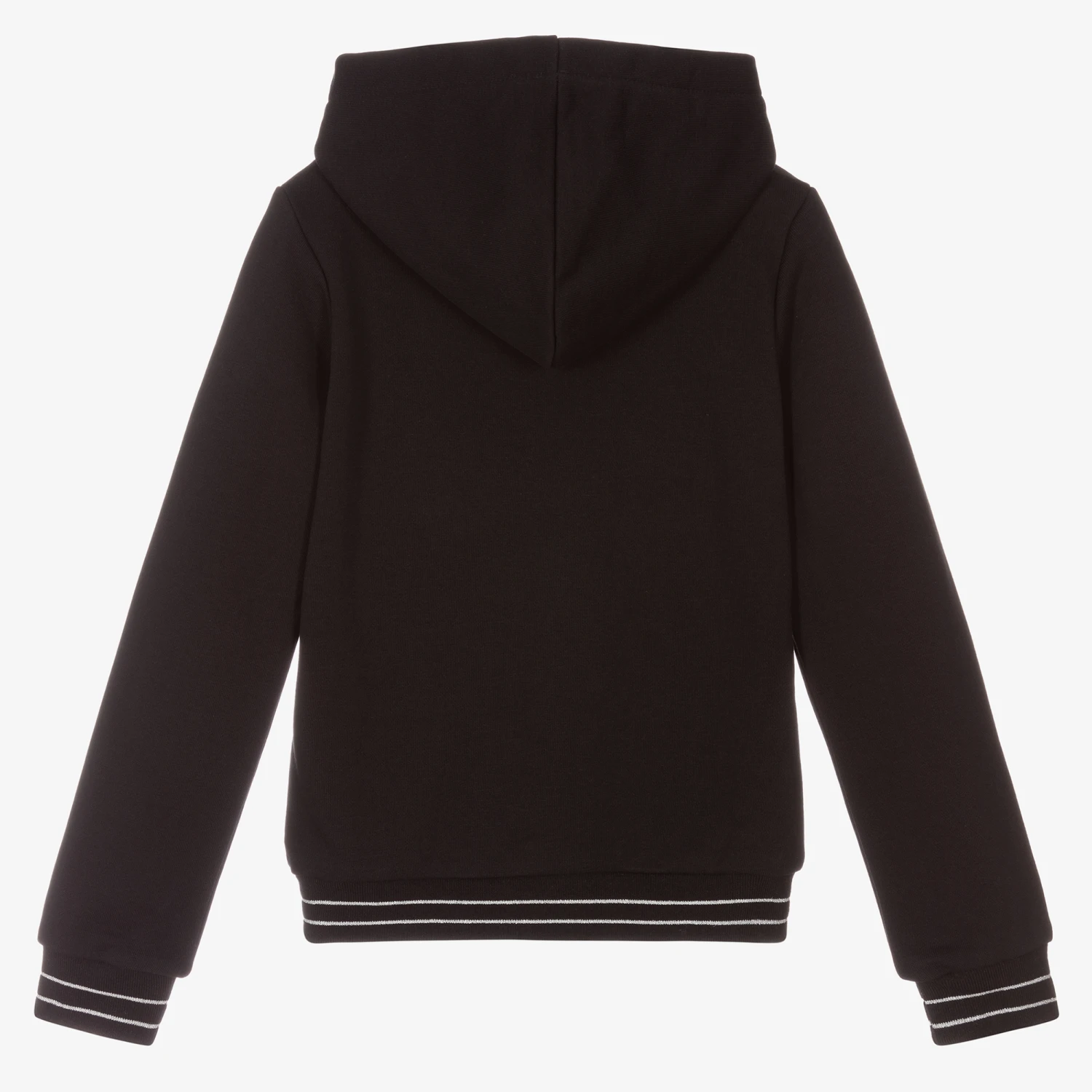 Dark navy blue hooded sweatshirt for girls by Dutch brand Le Chic, made in lightweight jersey. It has a shimmering sequinned heart on the front in shades of blue, surrounded by white logos and slogans, with a metal logo tab sewn below. There are glittery silver stripes on the ribbed trims.