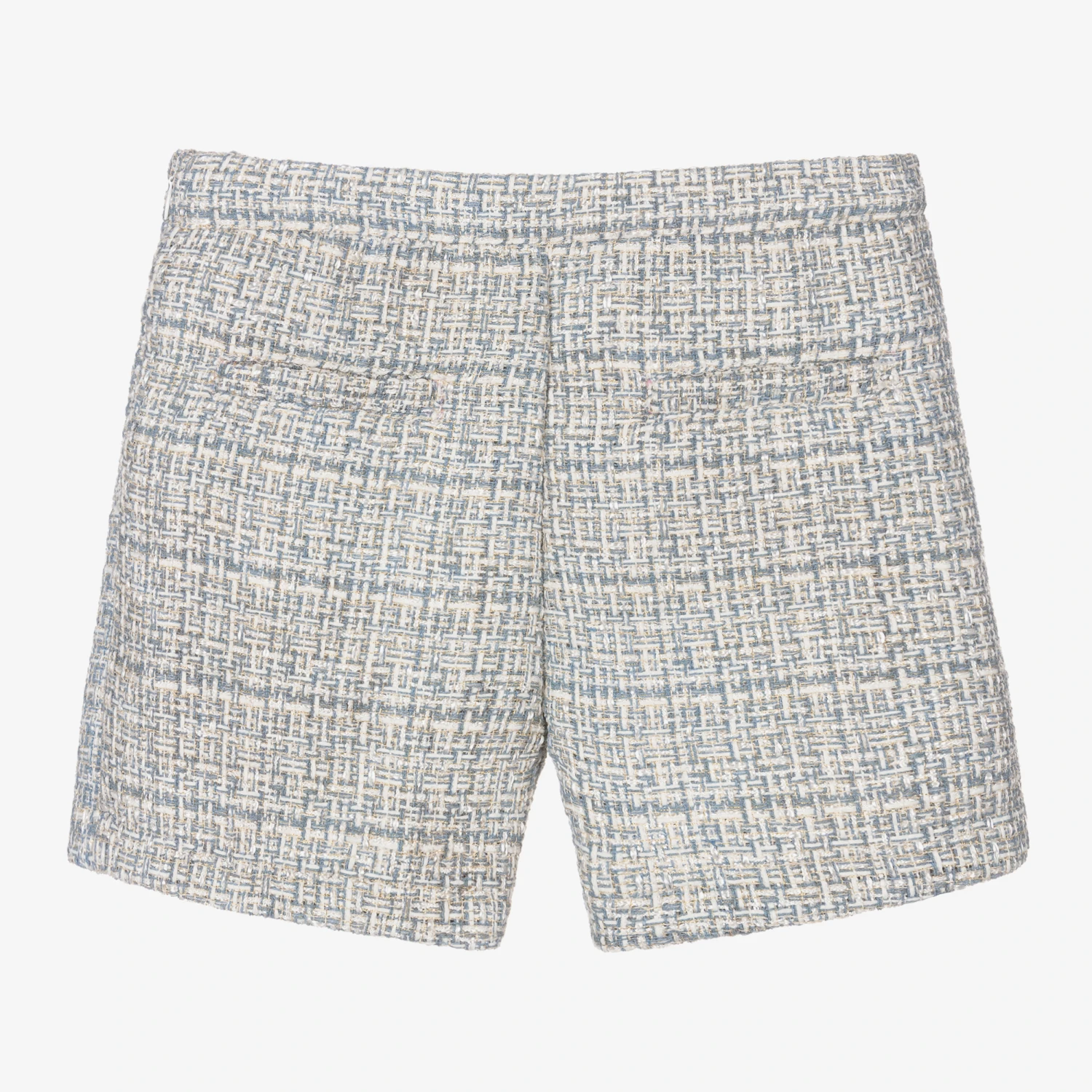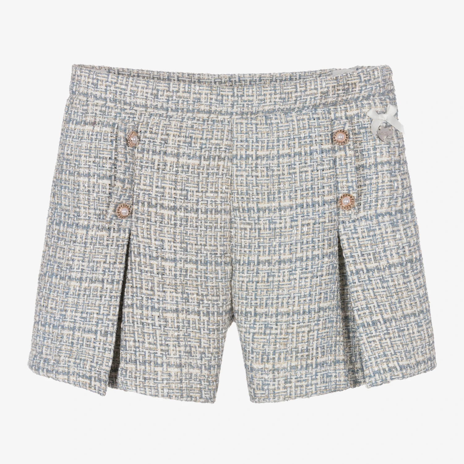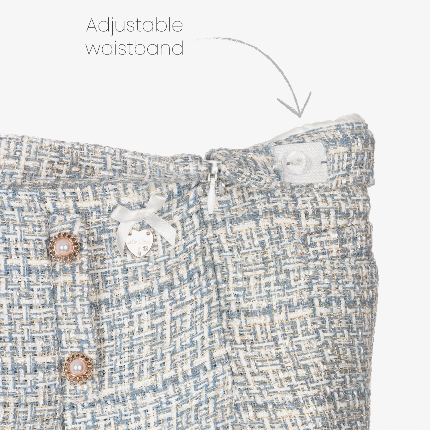 Ideal for those smarter moments, these blue tweed shorts for girls are by Le Chic. The tweed itself has a mid-weight weave, with shiny white and gold threads. There is a heart logo charm on the front and faux front pockets, detailed with gold pearl decorations. Fastening with a side zip, they have a satin lining and an adjustable waist for a comfortable fit.