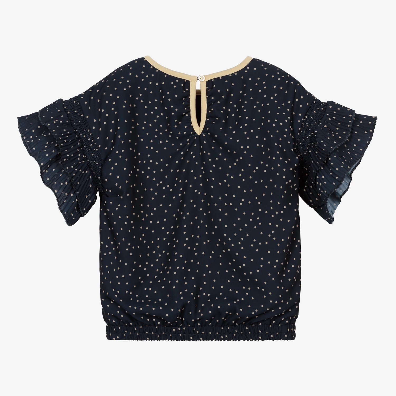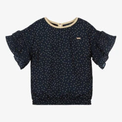 Girls navy blue blouse by Le Chic, made in soft and smooth recycled crêpe, with an all-over beige polka dot print. The short sleeves are tiered and pleated for a ruffled effect. There is a single button fastening on the back and the neckline is trimmed with beige jersey. It has a gold metal logo plate on the chest, and an elasticated hemline, designed to sit on the waistline.